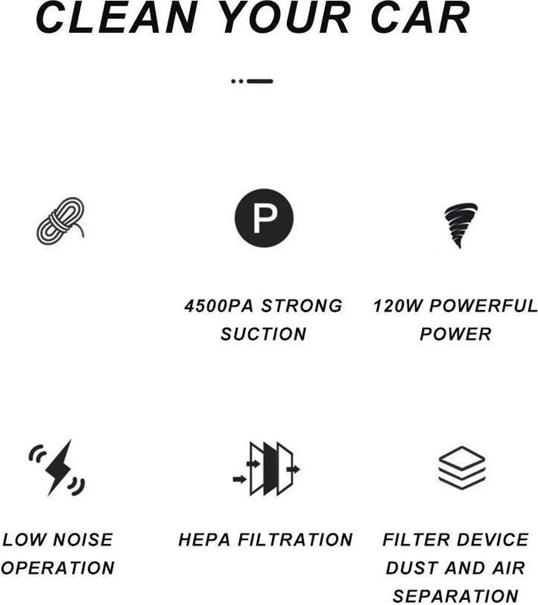 4, forte puissance d’aspiration: l’aspirateur de voiture 4500PA a une puissance élevée de 120 W, un moteur à turbine puissant et une grande puissance d’aspiration.
