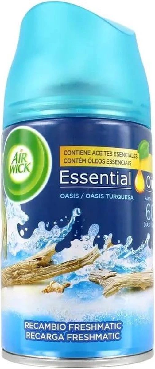 – Le spray assainisseur d’air Air Wick Life Scents Turquoise Oase diffuse un parfum frais avec des embruns marins, une brise chaude et des notes de bois flotté