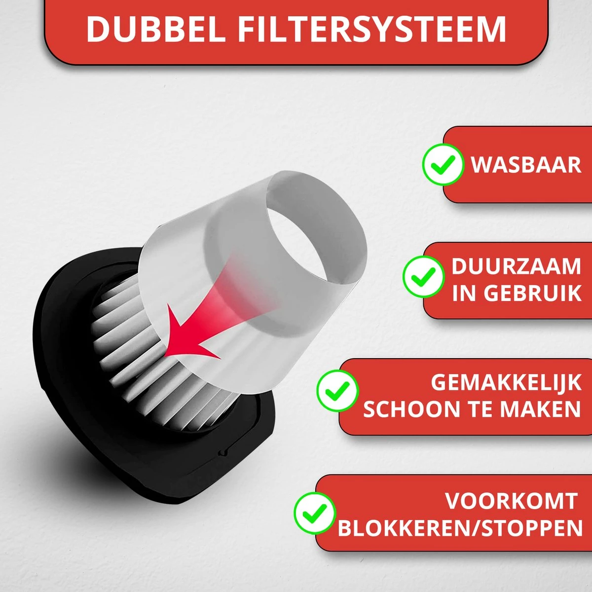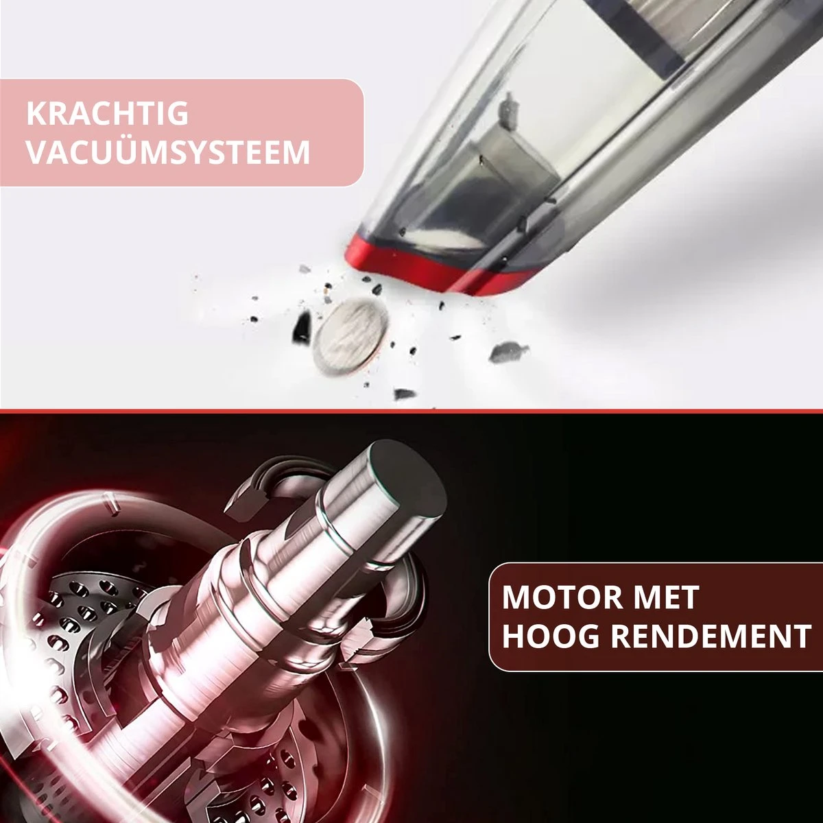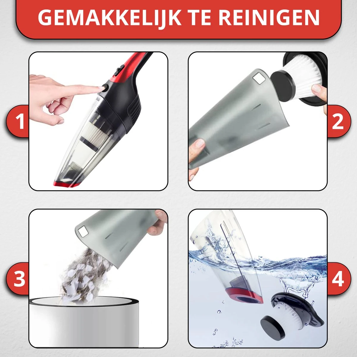 Pour un nettoyage complet et pour pouvoir atteindre tous les endroits difficiles d’accès, l’aspirateur est équipé de 3 accessoires supplémentaires. Un tuyau flexible pour les endroits difficiles d’accès où l’aspirateur à main est trop large. Une tête de brosse pour un nettoyage en profondeur et une tête d’aspirateur étroite pour les espaces étroits de la voiture ou entre les meubles.
