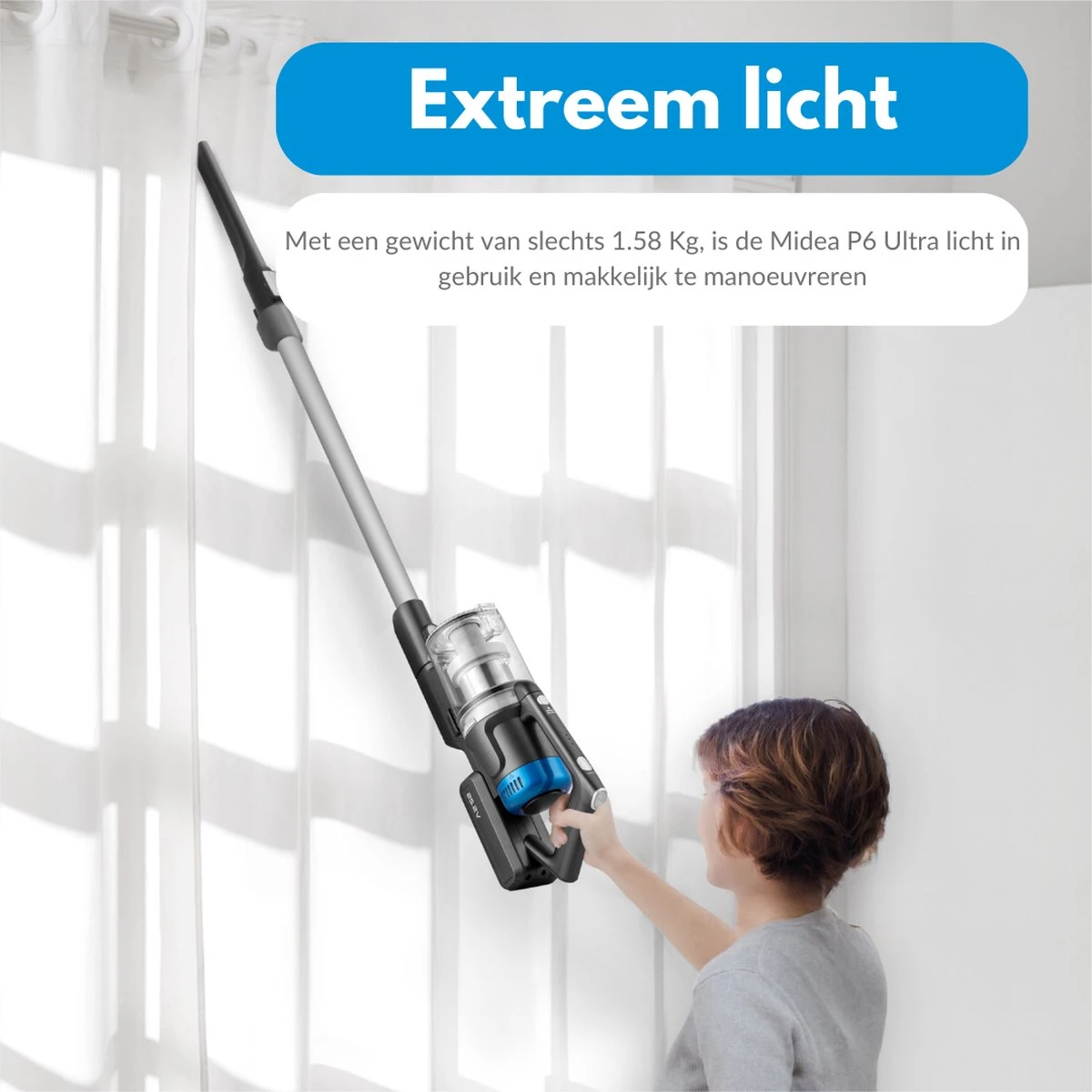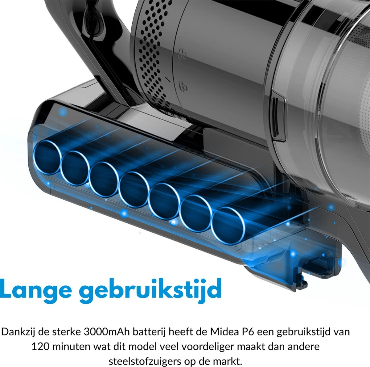 Avec cet aspirateur-balai P6 sans fil de Midea , vous pouvez désormais aspirer plus longtemps. Jusqu’à 120 minutes d’aspiration continue sur le réglage le plus bas et 45 minutes sur le réglage le plus élevé. A une puissance d’aspiration maximale de 20 000 Airwatts et dispose d’un bac à poussière extra large de 0,8 L. Multi Cyclone garantit que les particules de poussière se propagent mieux dans le récipient de collecte et que la puissance d’aspiration est maintenue. De plus, il est facile à entretenir, car la brosse et le bac de récupération peuvent être complètement déconnectés et rincés sous le robinet. Souffrez-vous d’allergies? Alors le Midea P6 est l’aspirateur voor jou! Grâce au système de filtration HEPA à cinq couches, 99,999 % de la poussière aspirée reste piégée dans le bac de collecte.