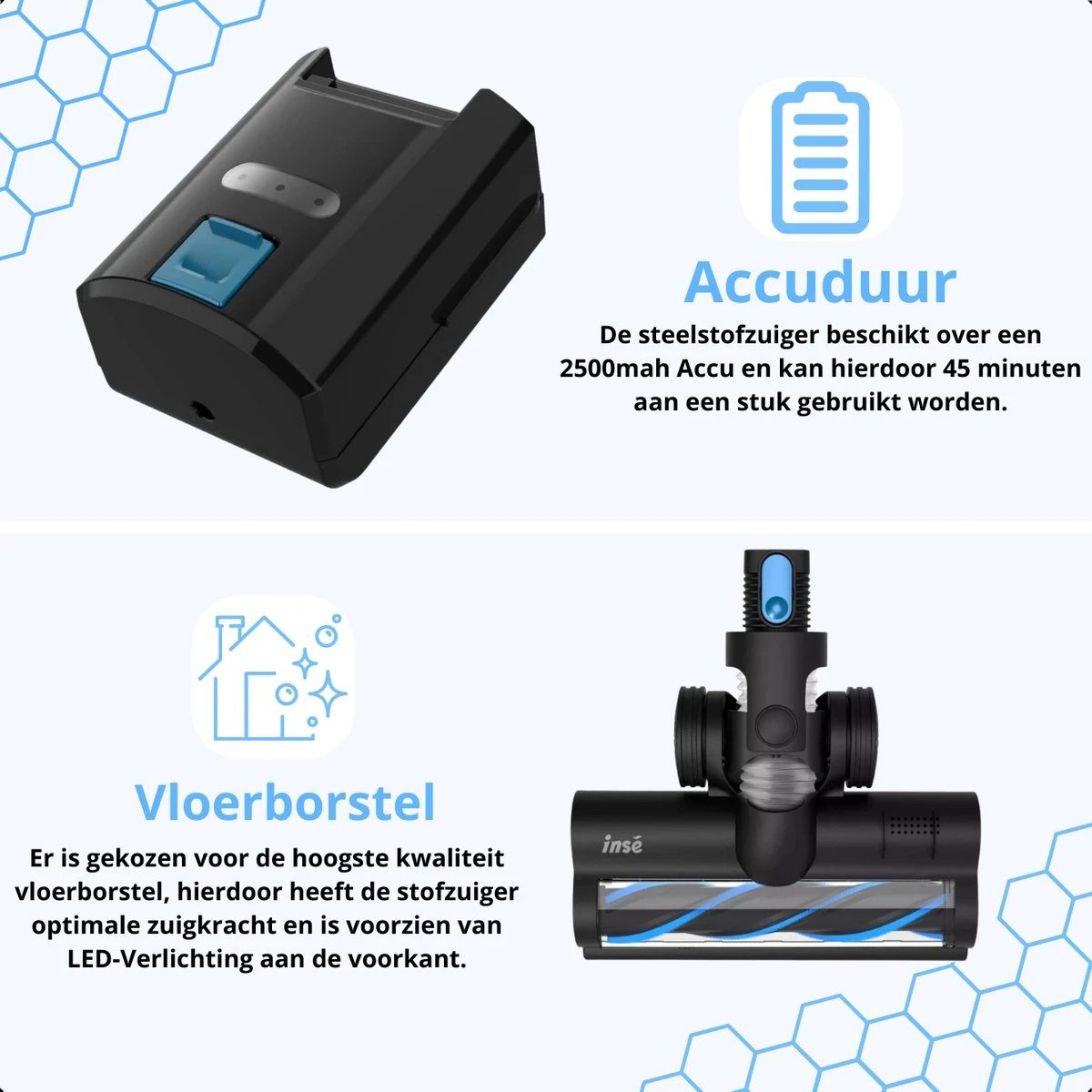 La batterie puissante fonctionne sur une batterie au lithium de 2500 mAh. La batterie est complètement chargée en 3 heures. Avec une batterie pleine et en position basse, vous pouvez utiliser l’aspirateur jusqu’à 45 minutes d’affilée. Réglez l’aspirateur sur le réglage élevé et vous pourrez l’utiliser jusqu’à 20 minutes.