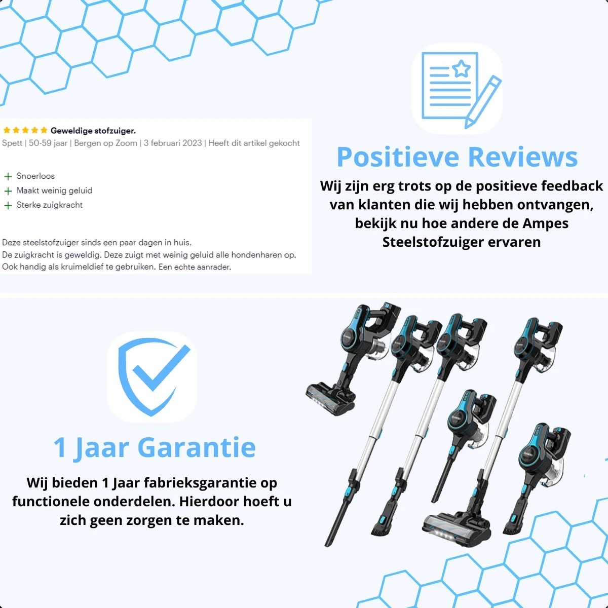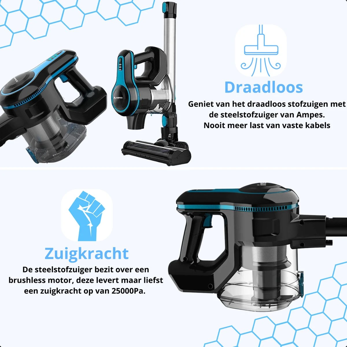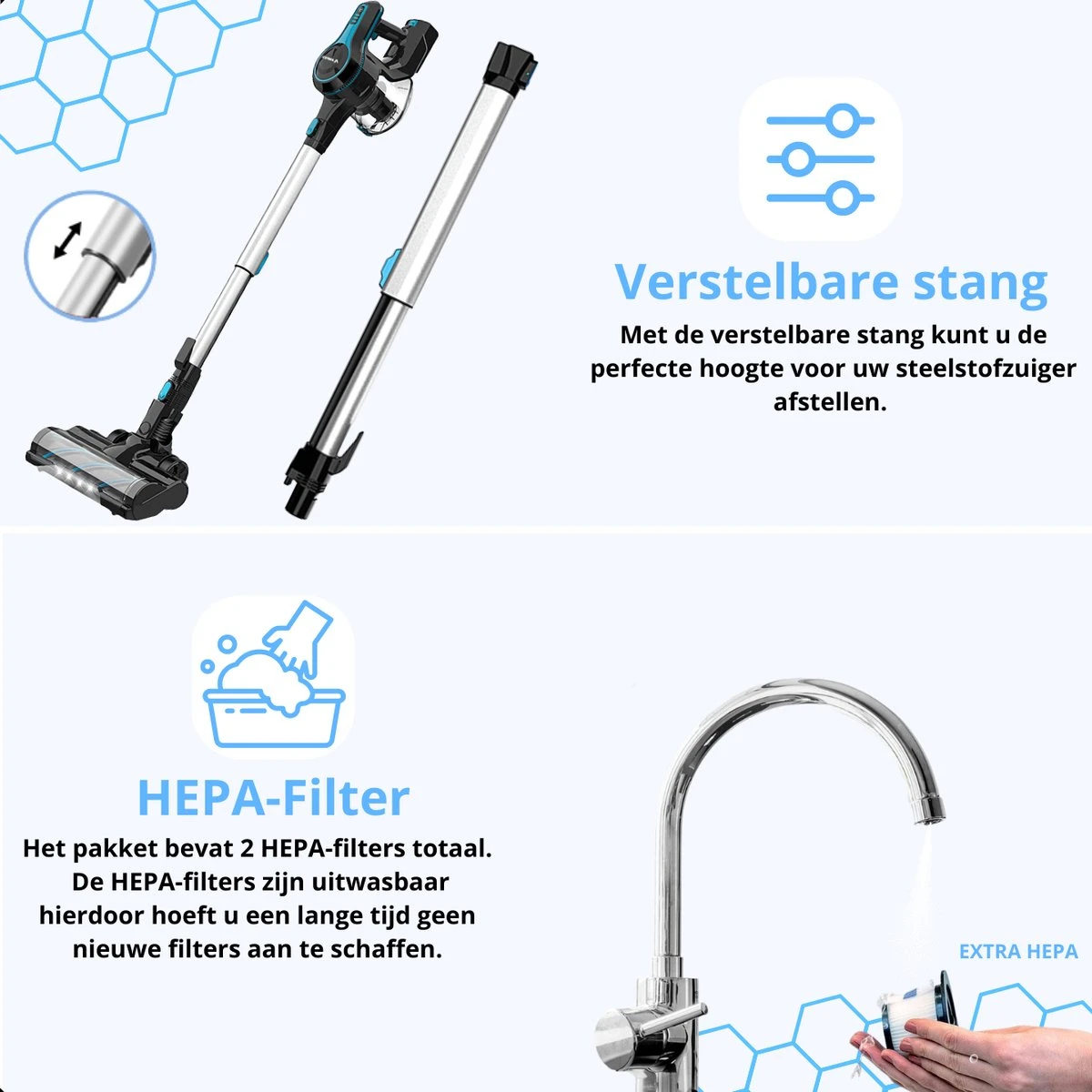 Nettoyez rapidement votre chambre sans vous soucier des câbles et des cordons. Nettoyez votre maison en un rien de temps avec l’aspirateur-balai sans fil 6 en 1. L’aspirateur est léger, maniable et contrairement aux autres aspirateurs-balais, la bouche peut pivoter à 180° ! L’aspirateur-balai est plus rapide et plus puissant que les types comparables. Même les endroits les plus difficiles d’accès sont faciles à nettoyer grâce aux 3 accessoires différents fournis. Cet aspirateur-balai est également équipé de filtres HEPA, ce qui le rend encore plus hygiénique, la batterie tient facilement 45 minutes, suffisamment de temps pour faire n’importe quel travail !