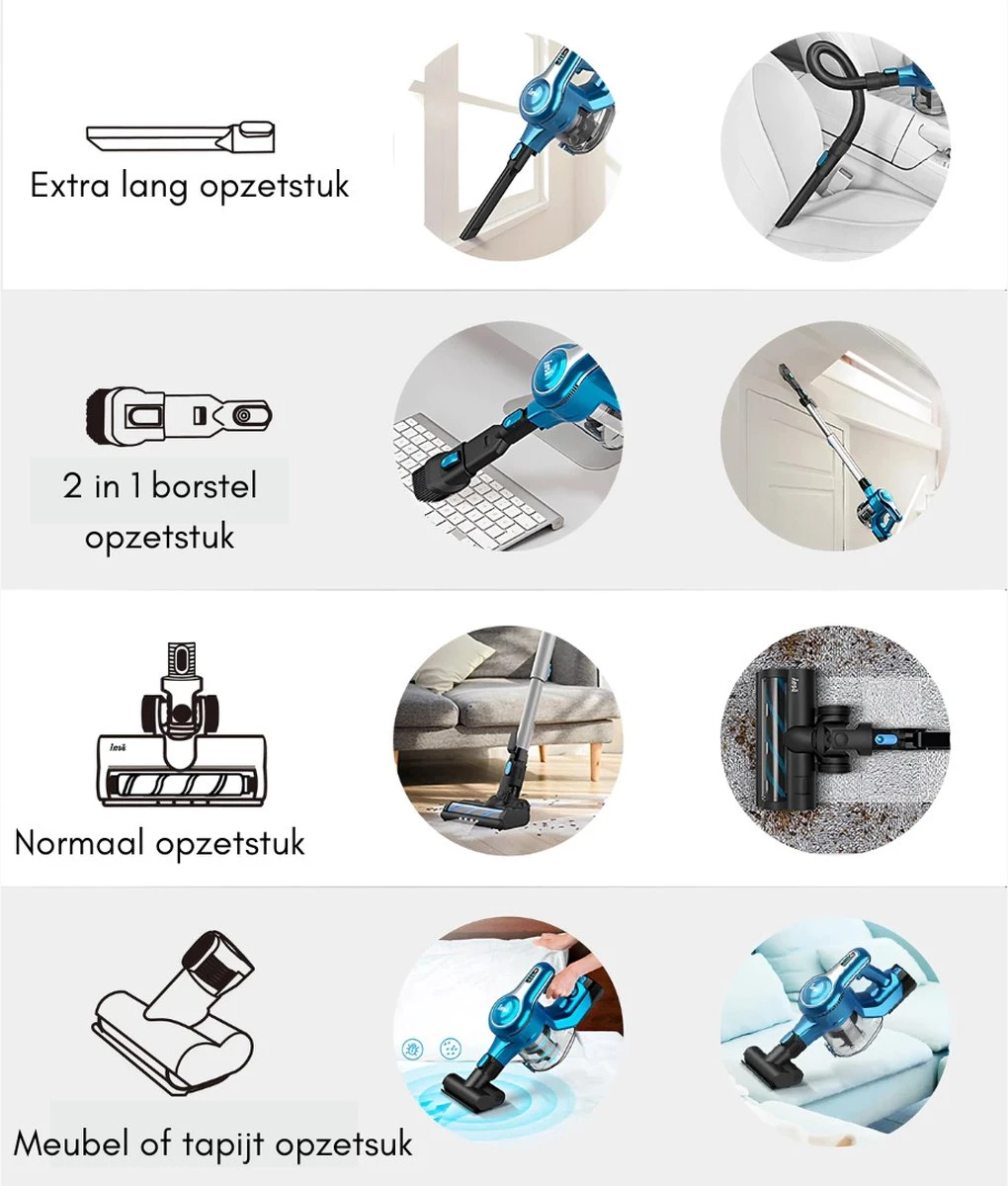 L’aspirateur-balai peut fonctionner comme aspirateur et comme petit voleur. Besoin de nettoyer les sols et moquettes ? Ensuite, vous pouvez utiliser la poignée, mais si vous devez vous rendre dans des endroits étroits et difficiles, vous pouvez utiliser le petit voleur pour ne citer qu’un exemple. L’aspirateur dispose également d’un accessoire spécial pour les endroits étroits et étroits, afin que vous ne manquiez pas un seul centimètre. L’aspirateur est livré avec 5 accessoires, vous avez donc une bonne solution pour chaque problème d’aspiration.