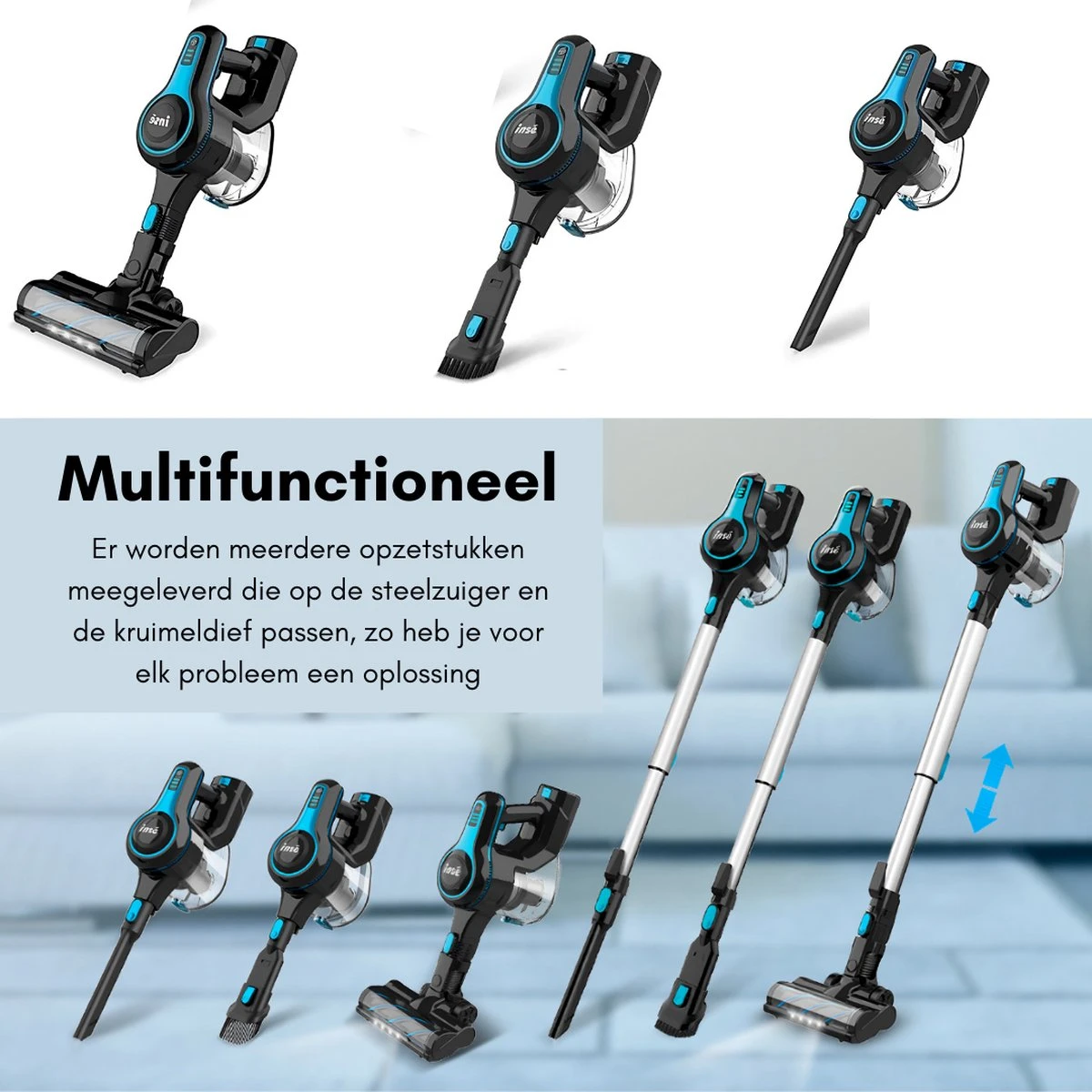 L’aspirateur-balai peut fonctionner comme aspirateur et comme petit voleur. Besoin de nettoyer les sols et moquettes ? Ensuite, vous pouvez utiliser la poignée, mais si vous devez vous rendre dans des endroits étroits et difficiles, vous pouvez utiliser le petit voleur pour ne citer qu’un exemple. L’aspirateur dispose également d’un accessoire spécial pour les endroits étroits et étroits, afin que vous ne manquiez pas un seul centimètre.