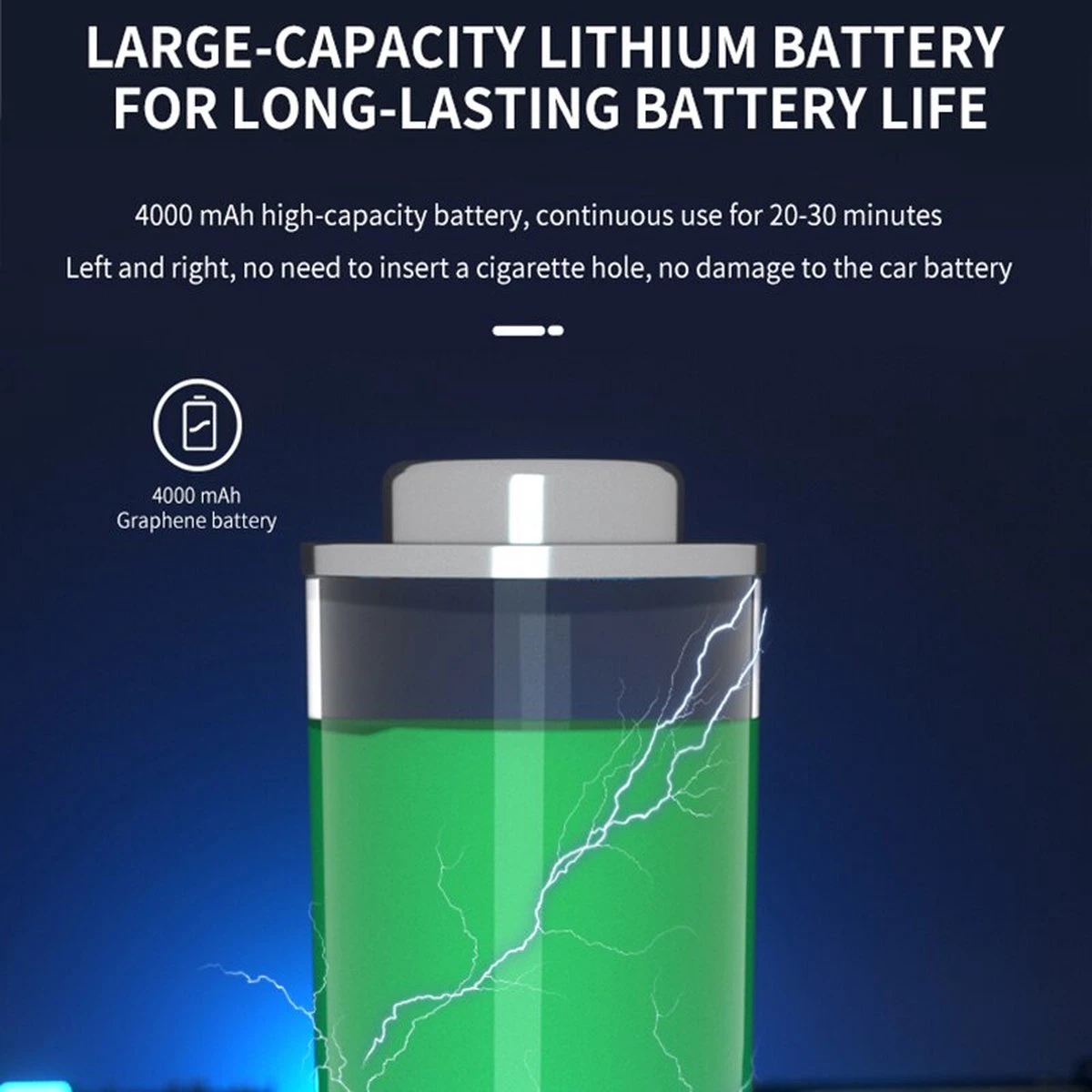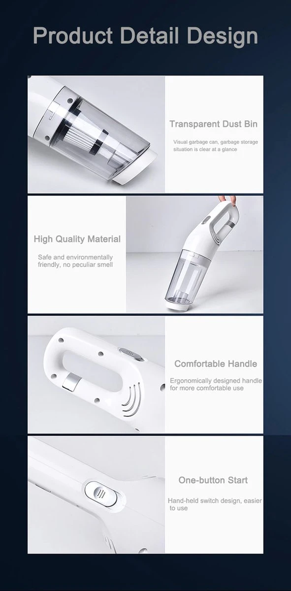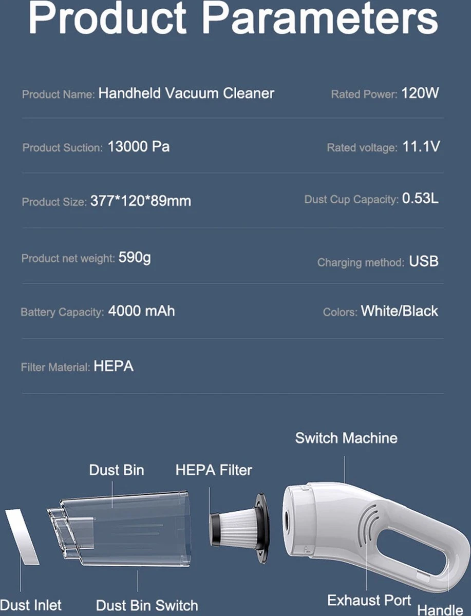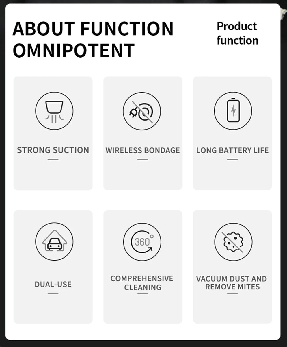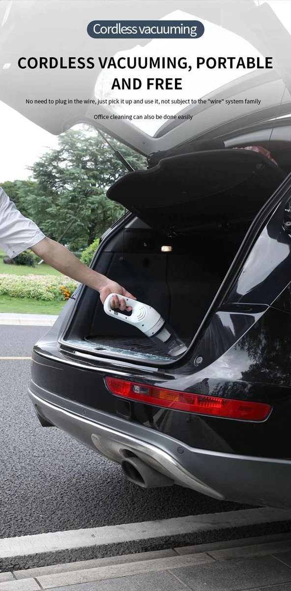 Cet aspirateur sans fil est entièrement sans fil, avec une batterie de 4000 mAh et un temps de travail continu de 30 minutes, vous pouvez aspirer tous les coins de la maison, du bureau ou de la voiture.