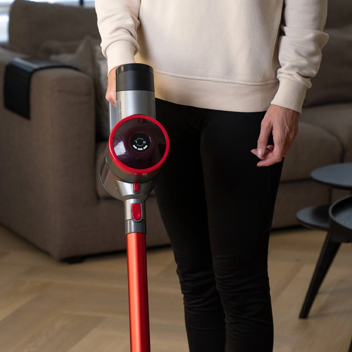L’aspirateur-balai est doté d’un éclairage LED pratique sur la brosse, ce qui facilite le nettoyage même dans les endroits les plus sombres. De plus, il y a un écran LED sur l’aspirateur. Cet écran pratique indique le niveau de charge de la batterie. Lorsque la batterie est presque vide, l’écran LED clignote, vous indiquant qu’il est temps de charger. Cela signifie que vous ne serez jamais sans batterie.