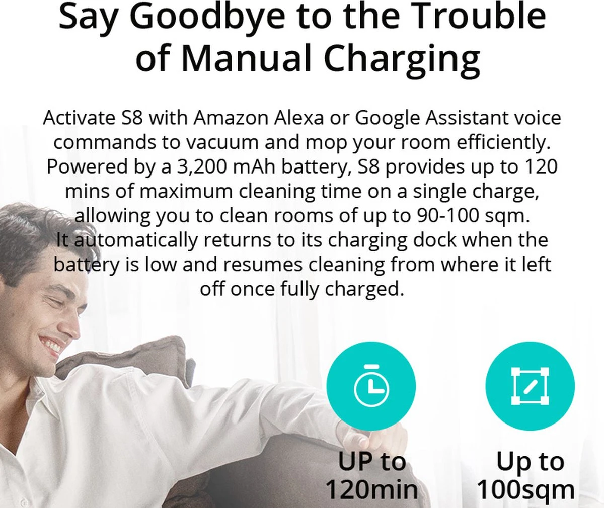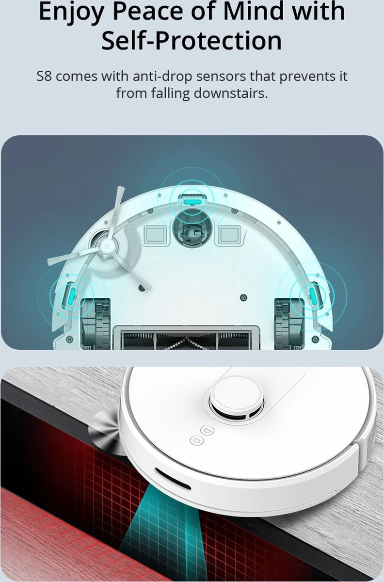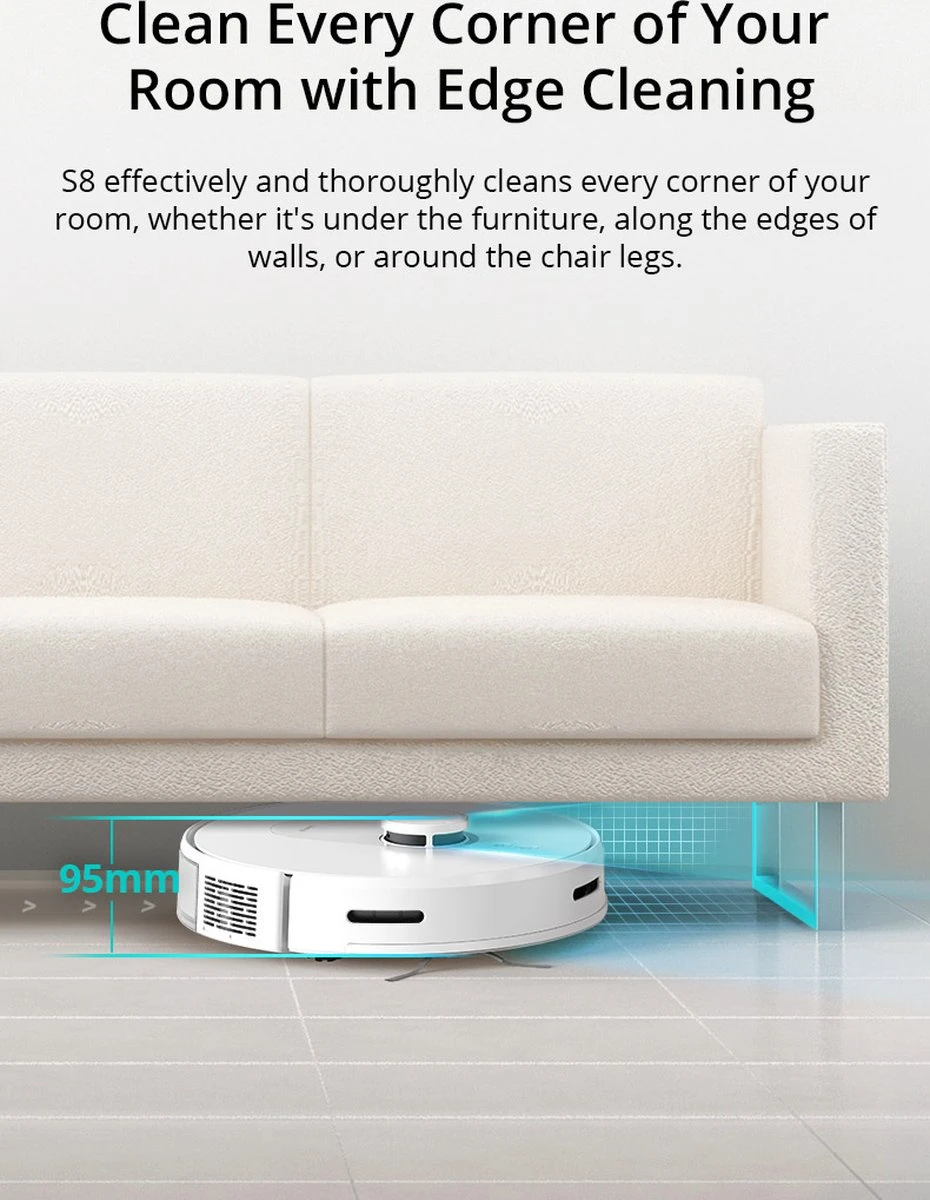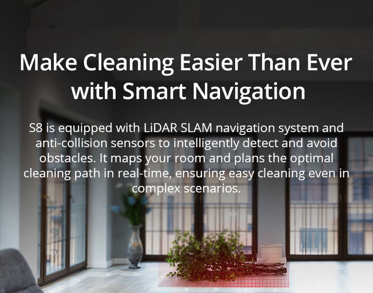 Grâce à sa hauteur de 9,5 centimètres et son diamètre de 34 centimètres, l’aspirateur robot peut facilement atteindre les endroits difficiles. Le S8 dispose d’un système de navigation Lidar SLAM et de capteurs pour s’assurer que l’aspirateur robot ne heurte ou ne tombe sur rien.
