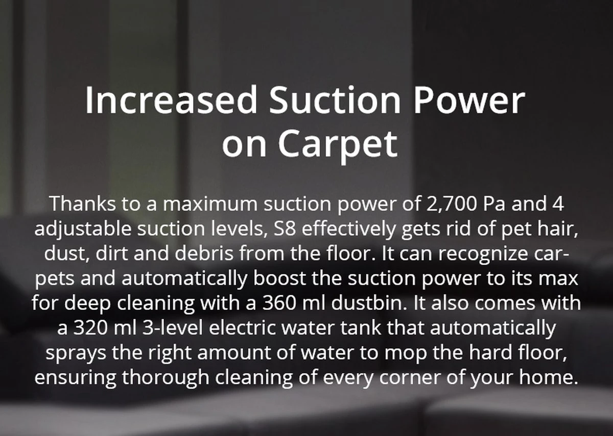 Parce qu’il a à la fois des fonctions d’aspiration et de nettoyage, le robot aspirateur 360 S8 peut littéralement tout gérer, ce qui signifie qu’il est capable de nettoyer en profondeur votre maison. Parce que cet aspirateur robot intelligent a également une puissance d’aspiration maximale de 2700 Pa qui peut basculer entre 4 niveaux d’aspiration différents, le S8 est également capable d’éliminer la poussière, la saleté et même les poils d’animaux du sol et de la moquette.