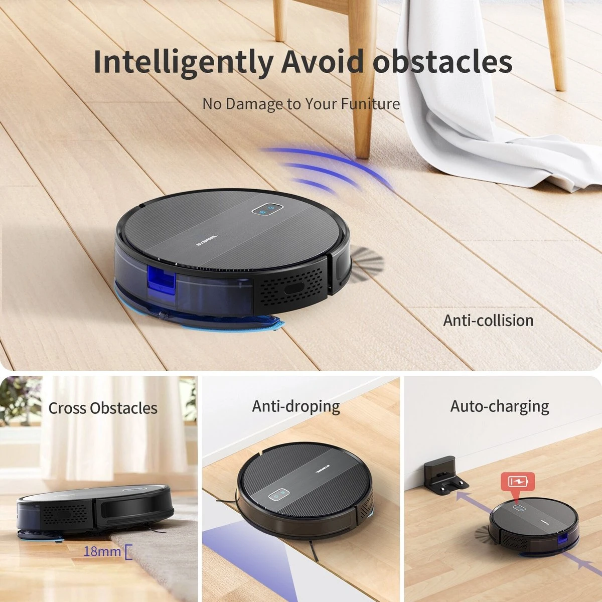 Le robot compatible avec Alexa et Google Assistant démarre et arrête facilement le nettoyage par les commandes vocales d’Alexa. À l’aide de l’application intelligente Tuya , vous pouvez facilement choisir le mode de nettoyage, changer la direction de nettoyage, trouver votre robot domestique sans effort. Utilisez l’aspirateur intelligent, vous pouvez nettoyer les horaires où que vous soyez, de sorte que l’aspirateur robot aspirateur et vadrouille peut vous donner une maison toujours propre. (Remarque : l’application ne prend en charge que le Wi-Fi 2,4 GHz)[Prévenir les collisions, les chutes et le robot aspirateur auto-chargeant :