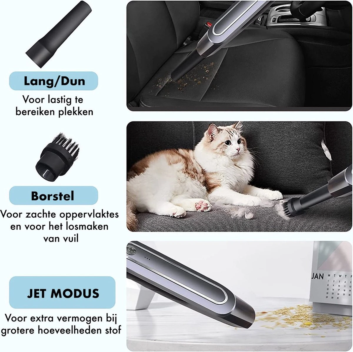 L’aspirateur à main peut être utilisé entièrement sans fil et se recharge facilement grâce au câble USB fourni. Ainsi, vous n’avez plus à vous soucier des cordons et vous pouvez tout nettoyer rapidement et facilement. Notre aspirateur a un design ergonomique et est donc très facile à utiliser. D’une simple pression sur un bouton, il fera tout le travail pour vous. Les accessoires inclus vous aident à aspirer correctement dans les zones les plus difficiles à atteindre.