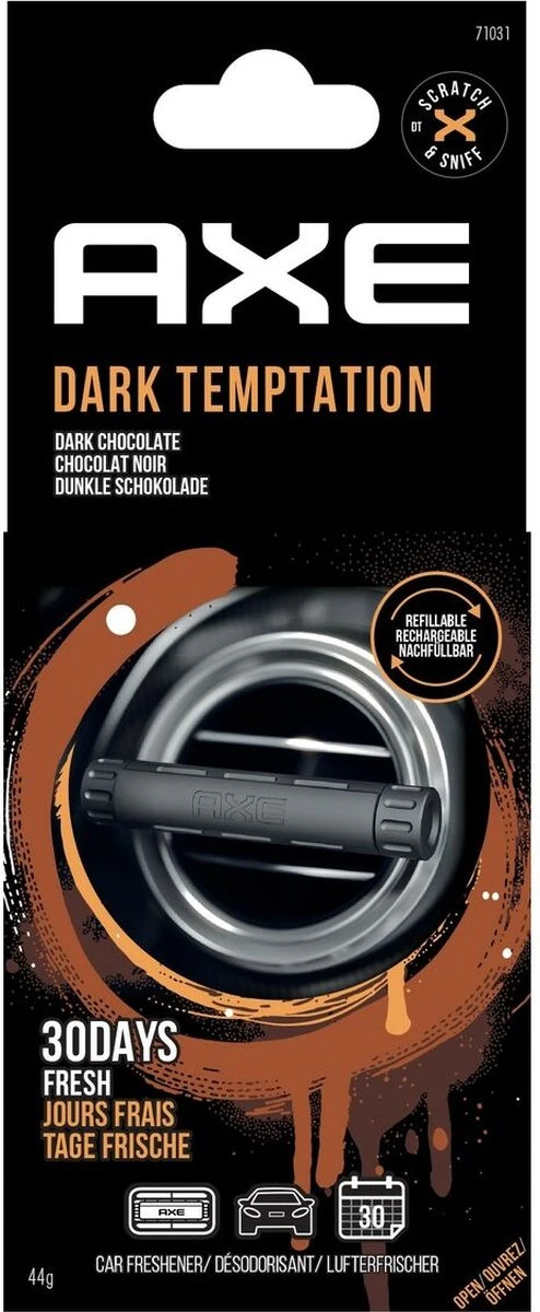Fatigué de cette mauvaise odeur dans votre voiture? Avec cet assainisseur d’air AX, vous n’aurez plus jamais une mauvaise odeur dans la voiture. Pendant trente jours, vous avez le merveilleux parfum Dark Temptation d’AX dans votre voiture. Il ne vous reste plus qu’à le mettre dans votre grille de ventilation. Vous pouvez régler vous-même l’intensité du parfum.