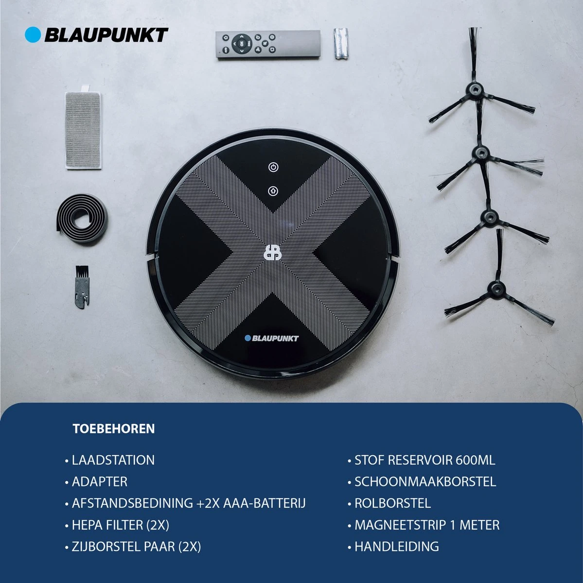 L’aspirateur robot Blaupunkt Bluebot XVAC avec réservoir d’eau est disponible en Cosmic Black (BPK-VCBB1XVB). Cet aspirateur robot avec fonction de nettoyage garantit que vos sols dans la maison sont aspirés et nettoyés, pendant que vous faites autre chose. Avez-vous des animaux ou de la moquette dans la maison ? Pas de problème La raclette à brosse rotative et les deux brosses latérales éliminent parfaitement cela. Ben vous êtes sensible à la poussière, c’est aussi une bonne aide à la maison. Parce qu’avec le filtre HEPA spécial de ce robot aspirateur, ce robot convient également aux personnes allergiques à la poussière. L’ aspirateur n’est-il pas autorisé à aller n’importe où dans la maison ? Placez ensuite la bande magnétique fournie pour arrêter le robot. Plus de soucis!
