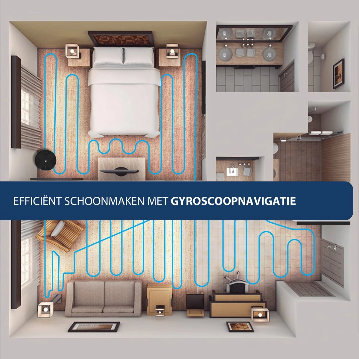 Grâce à la navigation Gyroscope, le Blaupunkt Bluebot XVAC peut nettoyer toute votre maison dans un mouvement en zigzag efficace et précis. De cette façon, aucun endroit ne manque et tout votre sol sera propre.