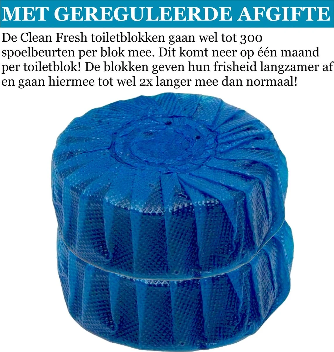 Les blocs sanitaires Clean Fresh durent jusqu’à 300 chasses chacun. Aux Pays-Bas, nous tirons la chasse d’eau en moyenne 5 fois par jour. Pour un ménage de 2 personnes, cela représente 300 chasses d’eau par mois. Les blocs sanitaires ont été testés de manière approfondie et chacun d’eux dure en moyenne un mois. Cela signifie que les cinq blocs sanitaires peuvent durer jusqu’à 5 mois ! Si l’on rince deux fois de suite, l’eau sera logiquement plus décolorée lors du deuxième rinçage. L’eau sera à nouveau entièrement colorée par le MGA après quelques minutes. L’avantage de l’application MGA réside principalement dans le fait que les blocs WC durent jusqu’à deux fois plus longtemps que la normale !