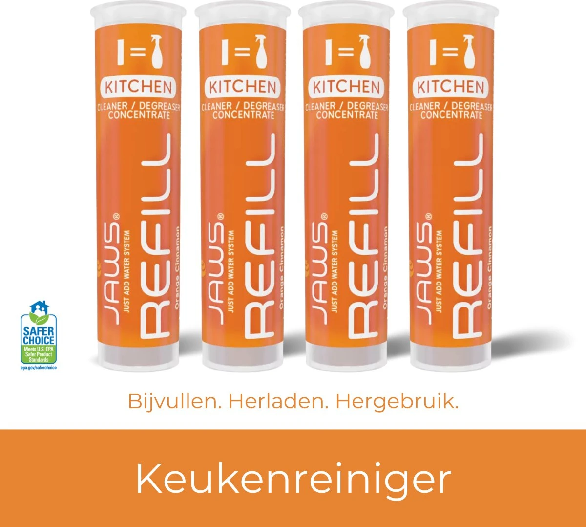 Si vous voulez être dur sur la graisse et la saleté mais doux sur la plupart des surfaces et de l’environnement, c’est le meilleur dégraissant de cuisine voor jou. Il est sans traces, polyvalent et certifié EPA Safer Choice, ce qui en fait une solution de nettoyage parfaite pour votre maison. Avec les capsules de recharge JAWS, vous économisez de l’argent et réduisez la quantité de plastique dans les décharges. Vous allez adorer le léger parfum de cannelle orange.