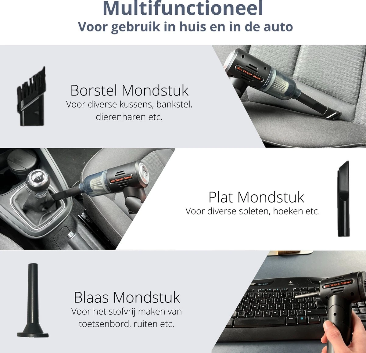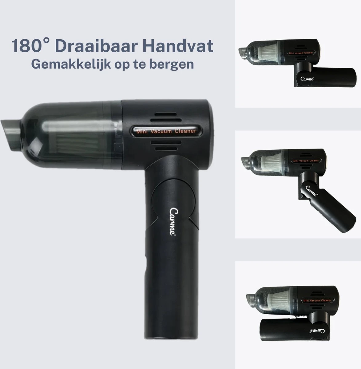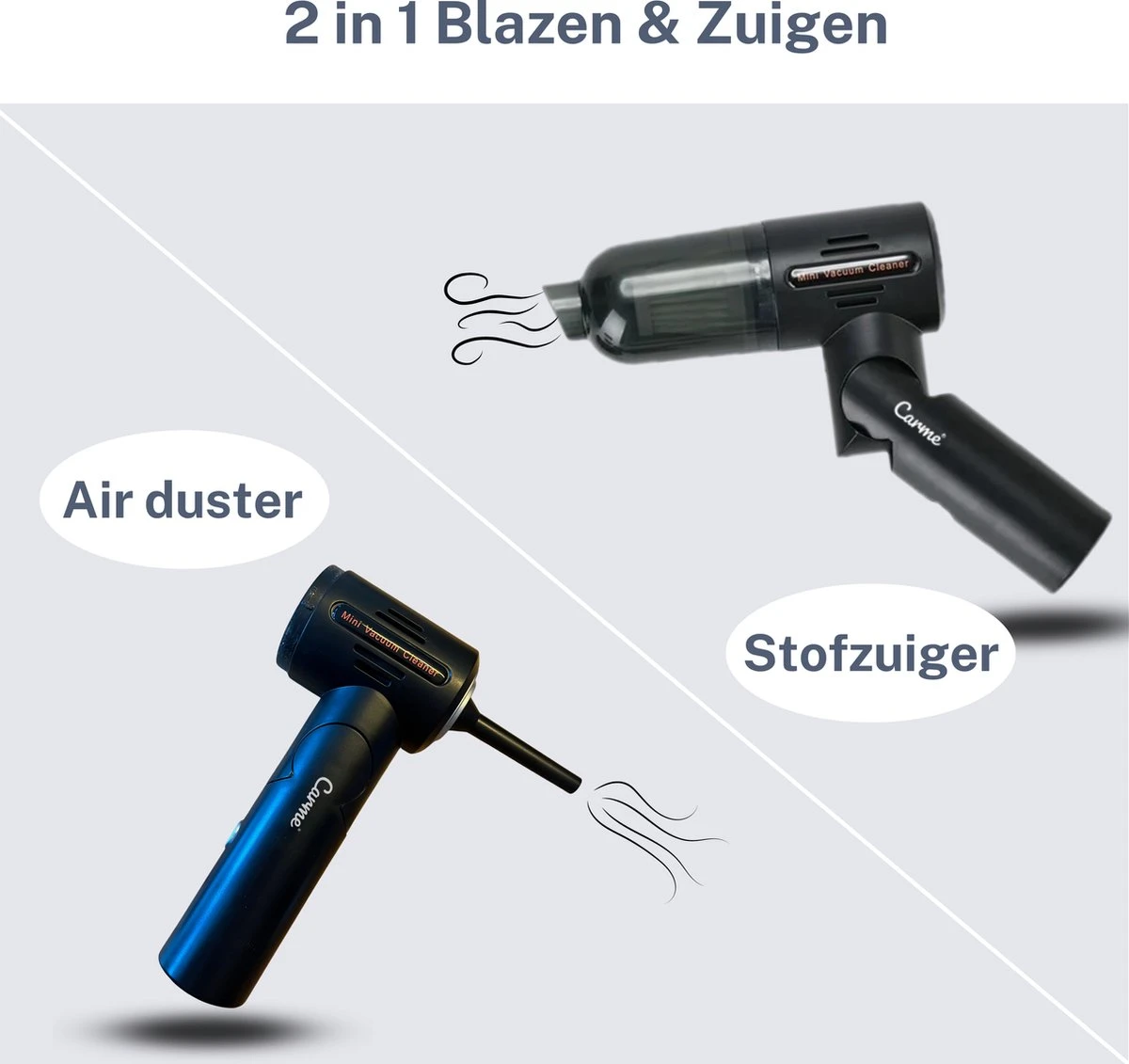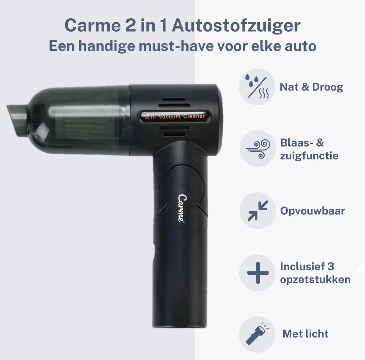 L’aspirateur de voiture Carme est livré avec trois têtes supplémentaires qui améliorent le processus d’aspiration. Et il y a plus! L’aspirateur de voiture dispose également d’un mode souffleur/poussière d’air. Cela vous permet d’éliminer facilement la poussière et la saleté des endroits difficiles d’accès de votre voiture. Ceci est particulièrement utile pour nettoyer les évents ou les petits coins, par exemple.