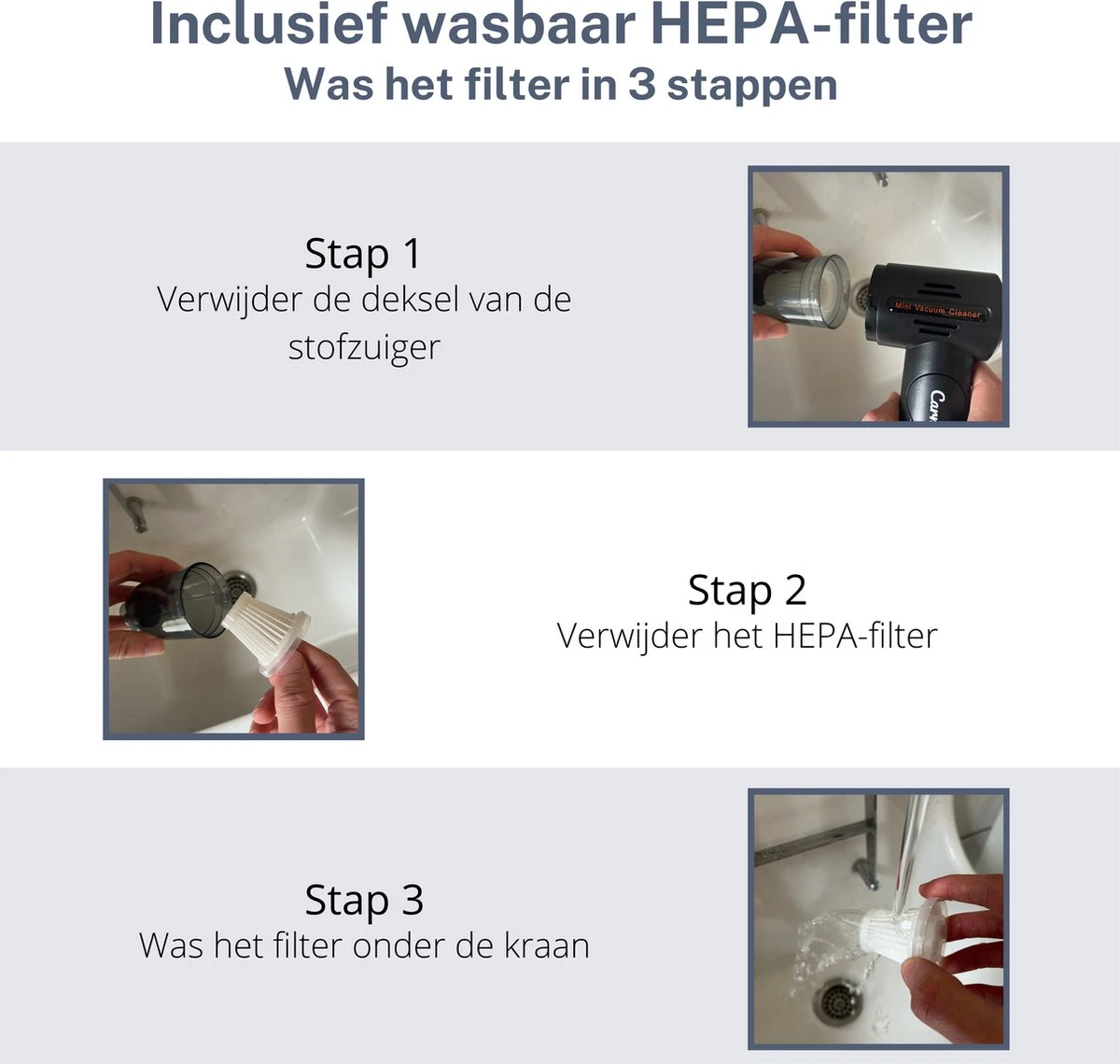 Nettoyer et vider l’aspirateur de voiture Carme est également très facile. Retirez le couvercle du Carme, videz le récipient et retirez le filtre Hepa. Lavez le filtre sous le robinet et vous êtes prêt à reprendre l’aspiration.