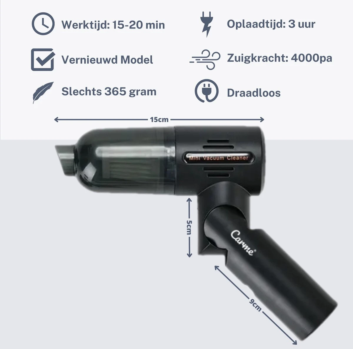 On le sait tous : vos enfants ou vos invités prennent place dans votre voiture et laissent derrière eux un énorme gâchis. Ou peut-être avez-vous vous-même mangé dans la voiture et votre voiture n’est plus aussi propre que vous le souhaitez. Les miettes, la poussière et le sable s’accumulent facilement dans votre voiture. L’aspirateur de voiture Carme relève ce défi ! L’aspirateur de voiture Carme est sans fil et facile à ranger dans votre voiture. De plus, il est rechargeable, aussi bien en voiture qu’à la maison. Vous pouvez donc l’utiliser à tout moment et n’importe où. De plus, le Carme dispose d’un filtre Hepa qui aspire les petites particules de poussière, le pollen et les bactéries.