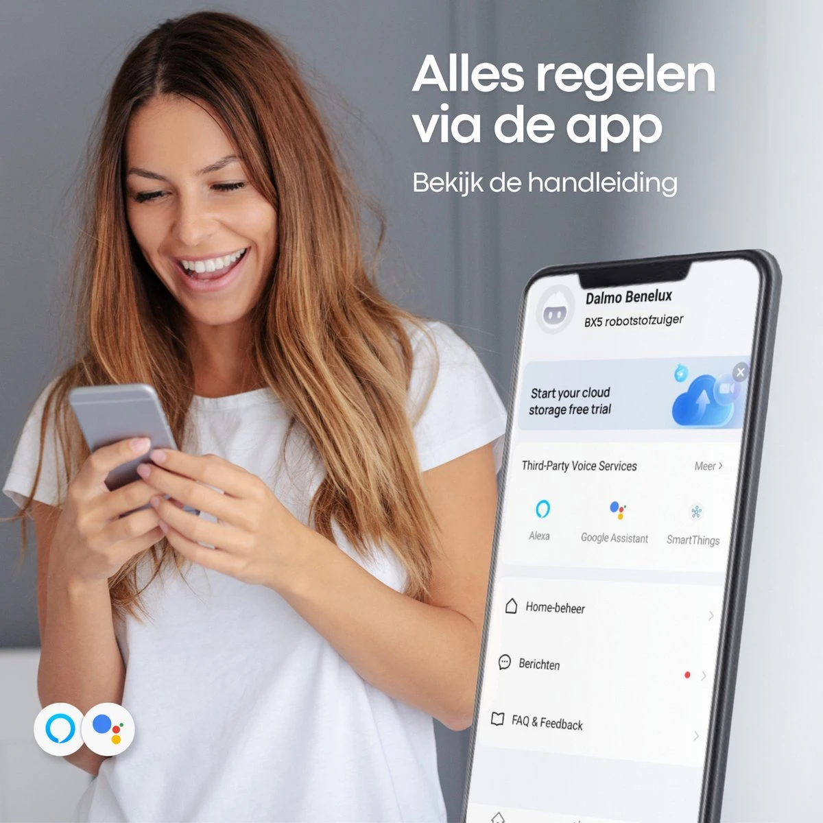 L’aspirateur robot 3 en 1, avec ses 2 brosses, élimine les poussières aspirées par le robot. Choisissez la fonction que vous souhaitez utiliser, de l’aspiration au nettoyage ou même au brossage et laissez le BX5 vous surprendre avec ses caractéristiques uniques. Via l’application, vous pouvez faire nettoyer l’aspirateur quand cela vous convient le mieux.