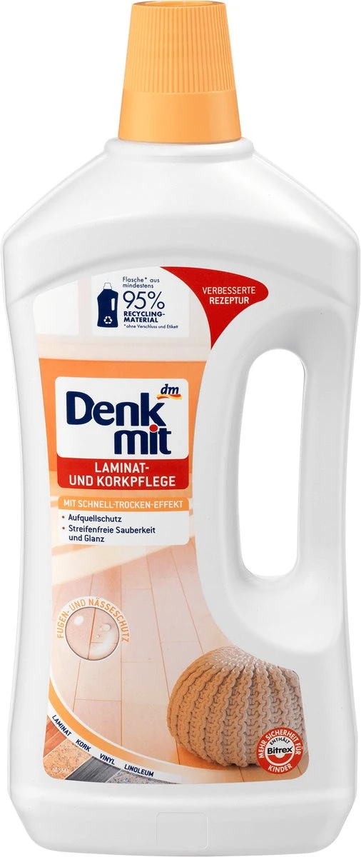 Le nettoyant pour sols stratifiés et liège avec effet de séchage rapide de Denkmit nettoie et entretient tous les sols Parquet stratifié et liège, ainsi que les sols en bois cirés. Des ingrédients spéciaux protègent les articulations contre les gonflements indésirables dus à l’humidité et à l’humidité. Le résultat est une salle blanche sans traces.