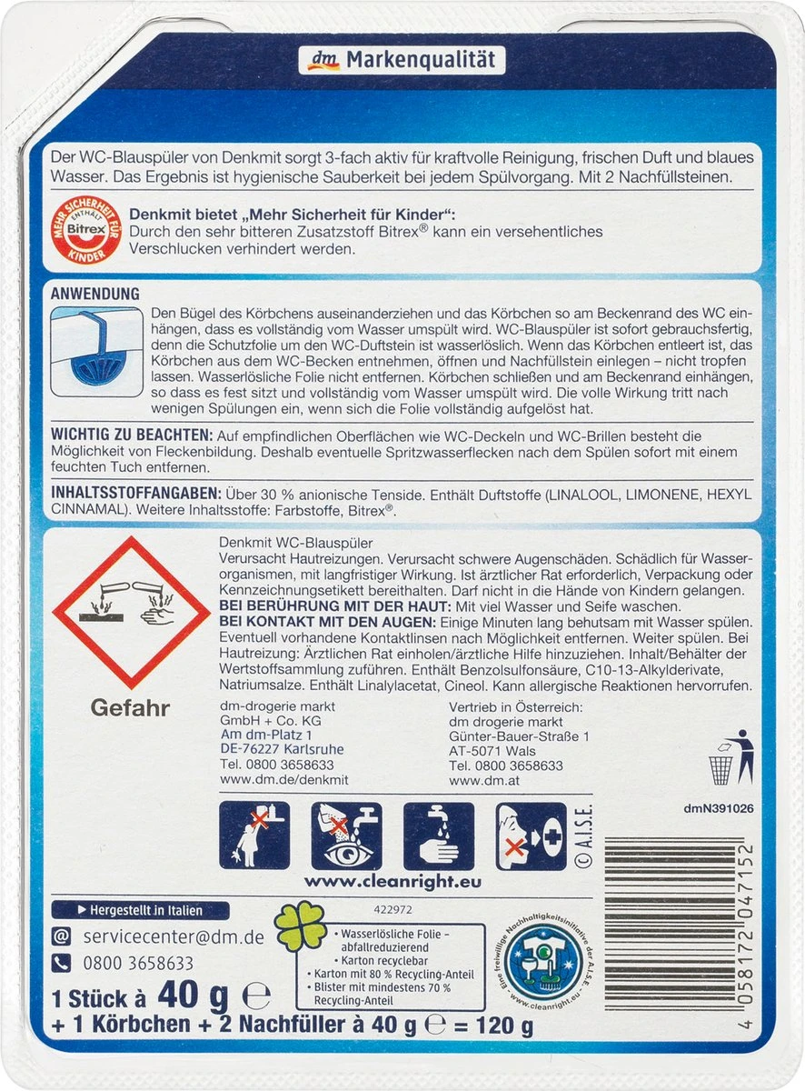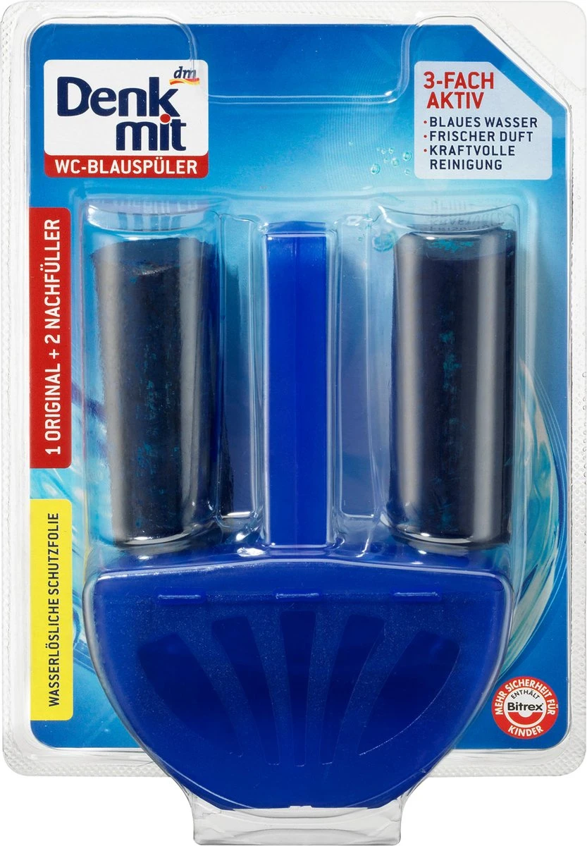 La chasse d’eau de Denkmit a une triple action pour un nettoyage puissant, un parfum frais et une eau bleue. Le résultat est une propreté hygiénique à chaque chasse. Avec 2 pierres de recharge.