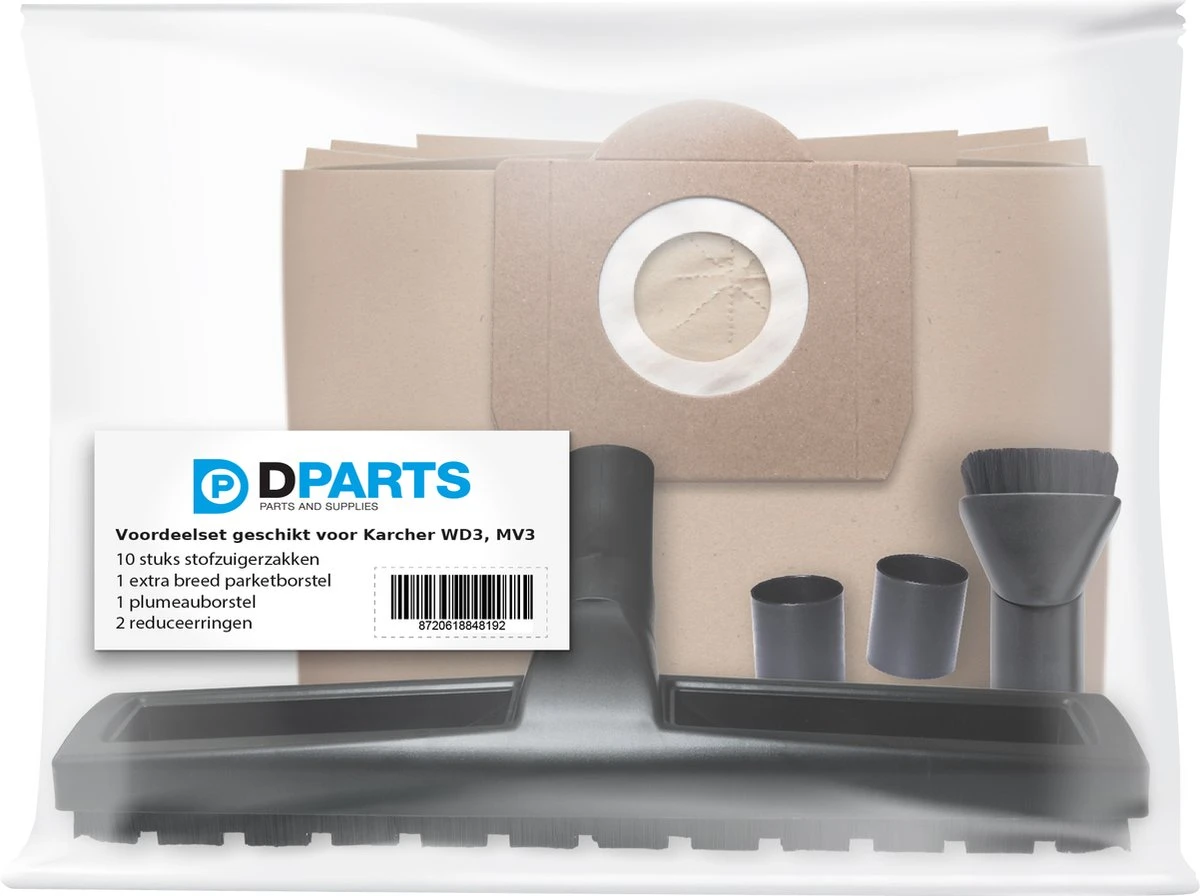 Avec ce Dparts, vous pouvez vous remettre au travail avec votre aspirateur Karcher ! Cet ensemble comprend toutes les nécessités de base pour passer l’aspirateur. Vous obtenez : 10 sacs à poussière, 1 brosse parquet extra large (pour sols durs tels que parquet, stratifié, vinyle, etc.), 1 brosse plumeau pour meubles, appuis de fenêtre, etc. et 2 anneaux réducteurs pour garantir que vos accessoires soient toujours adapter.