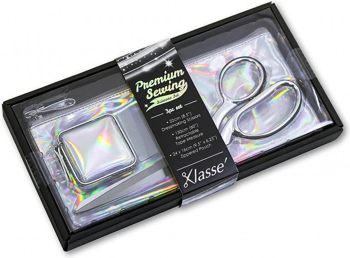 coffret cadeau de luxe avec des ciseaux à tissu argentés et un ruban à mesurer argenté et une pochette.