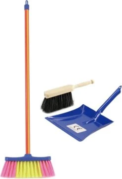 Kit de nettoyage de Jouets . L’ensemble comprend une pelle à poussière avec des poils en plastique noir doux, une pelle en métal bleu et un balai intérieur coloré. Matériau pelle à poussière: bois / plastique. Matériau pelle à poussière: métal. Matériau du balai: plastique, taille environ 61 cm. composé de 1x Balai pour enfants en plastique bleu / jaune / rose avec poignée 61 cm, 1x Pelle à poussière / brosse à main Kinder avec manche en bois, 1x Pelle pour enfants bleu en métal 13 x 10 cm