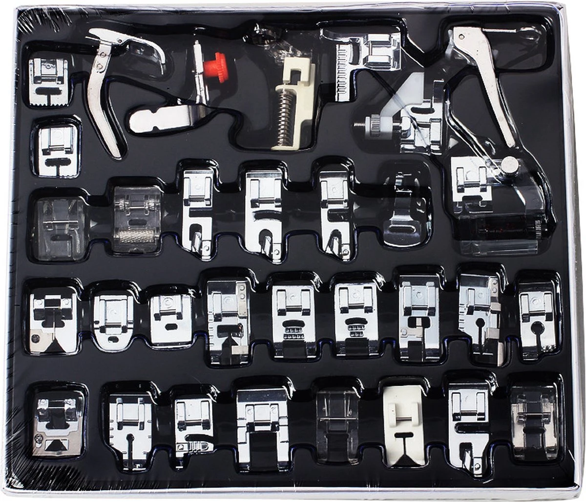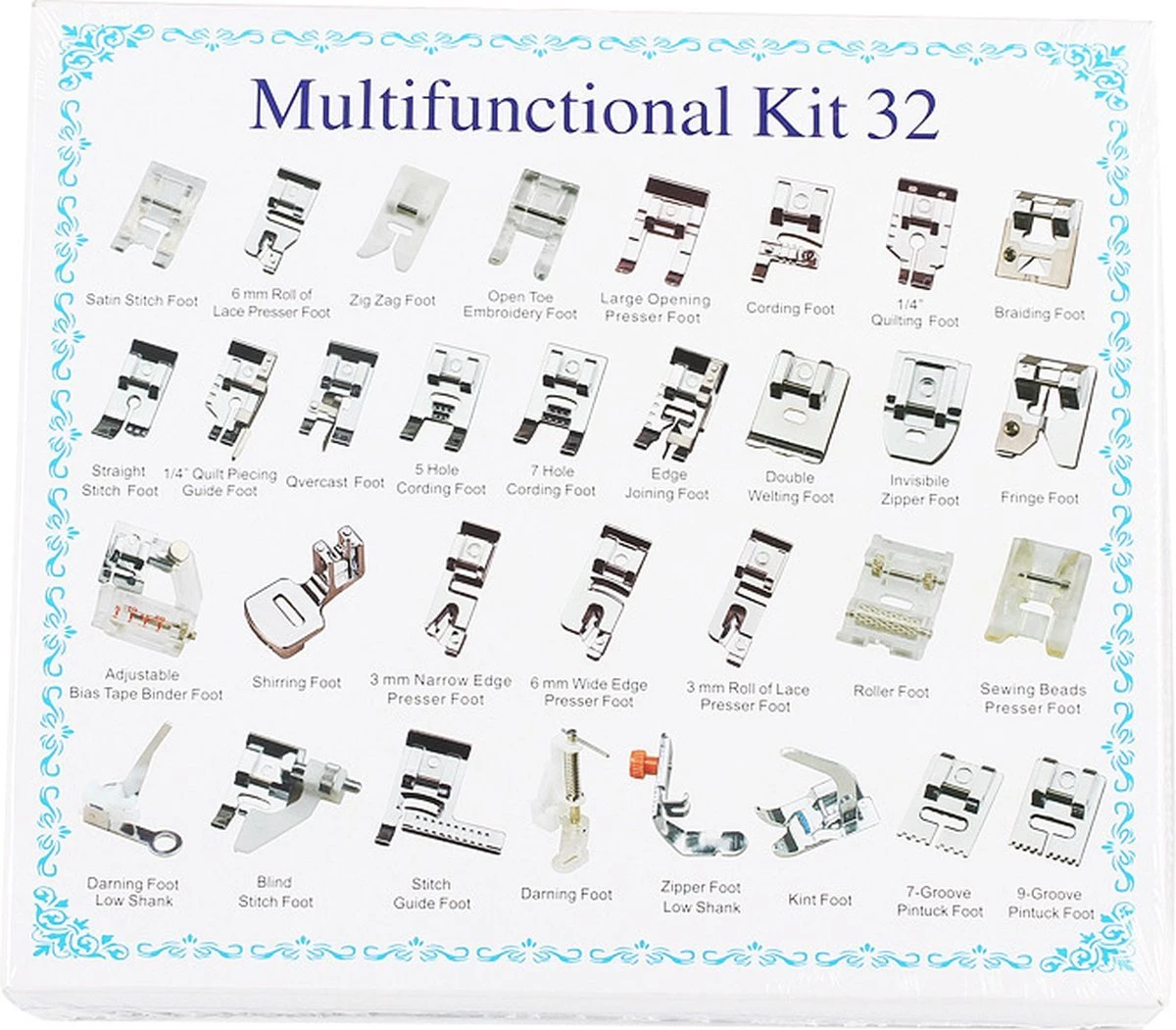 Ce lot contient 32 des pieds les plus populaires pour coudre des points droits, des lignes précises et de beaux projets, ce lot se compose des pieds presseurs suivants :
