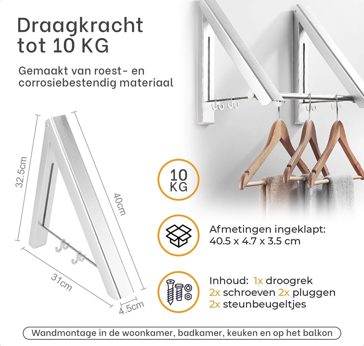 Ce séchoir pliable multifonctionnel de Milano Luxurious est idéal pour suspendre, aérer et sécher plusieurs vêtements. Le portant à vêtements mural a une très forte capacité de charge allant jusqu’à 10 kg, grâce à sa construction triangulaire stable et solide. Après avoir utilisé la tringle à vêtements, vous pouvez simplement la replier, ce qui rend le support de garde-robe peu encombrant. Le portemanteau se monte facilement et rapidement contre l’un de vos murs dans la cuisine, la salle de bain, la chambre et sur le balcon.