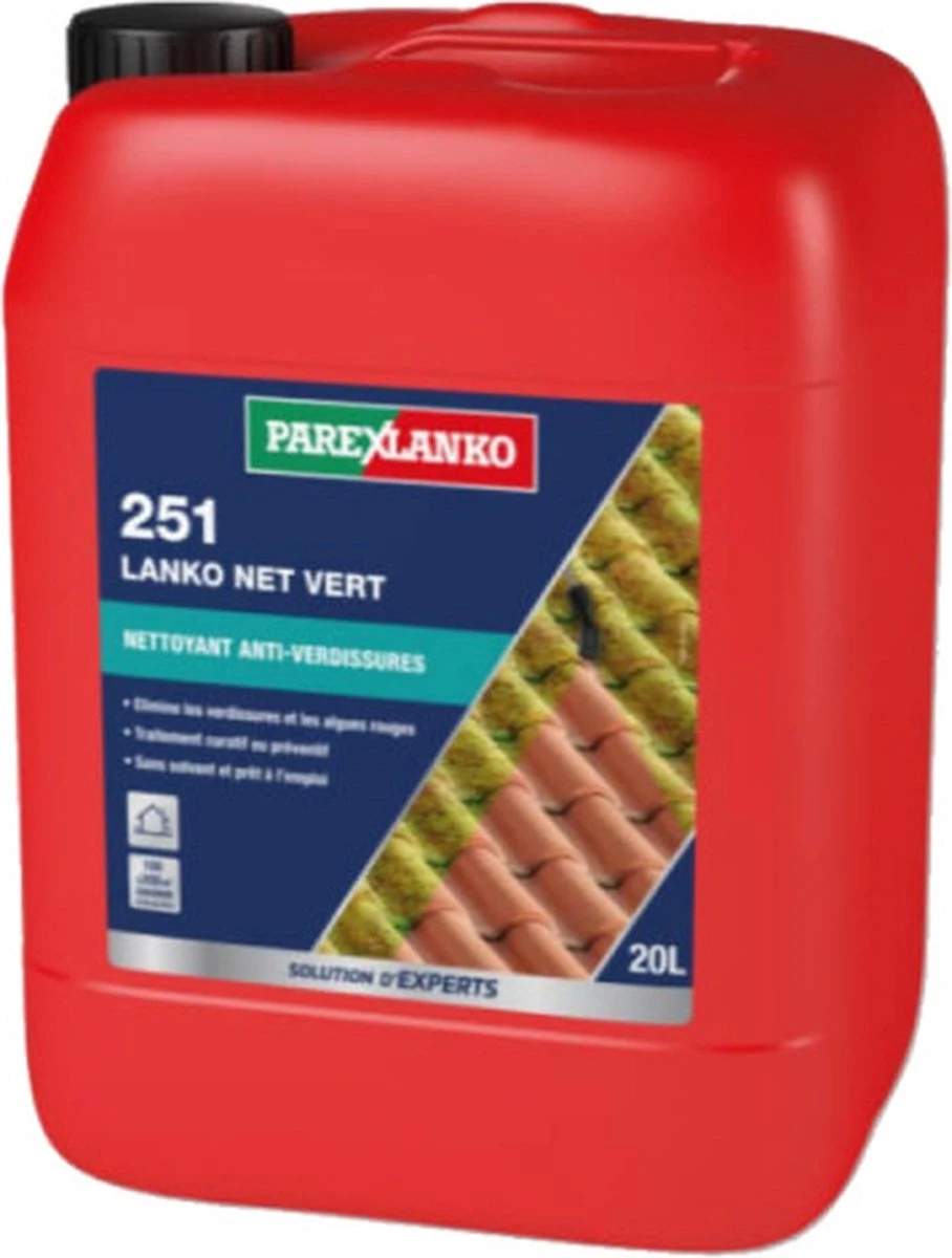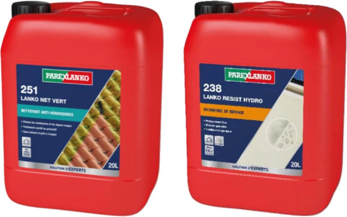 Présentation : Ce pack PREXLANKO contient un traitement anti-verdissement 251 LANKO NET GREEN pour sols, façades & toitures. C’est un agent nettoyant prêt à l’emploi qui prévient, traite et neutralise la pollution organique causée par les algues, les lichens, les champignons, etc. Vendu avec un produit d’étanchéité prêt à l’emploi pour façades, terrasses et toitures. Ce produit multi-surfaces protège les murs et les sols de l’eau. Il adhère en permanence aux différentes surfaces par capillarité. Bénéfices : Traitement anti-verdissement 251 LANKO NET VERT – sols, façades & toitures PAREXLANKO – 150 à 200m² – 20 L : Réduction des pousses vertes et des algues rouges Traitement curatif et préventif contre les champignons et les algues Sans solvant et prêt à l’emploi Protection antitaches 238 LANKO RÉSIST HYDRO – hydrofuge pour façades, terrasses & toitures PAREXLANKO – 20 L – 100 m² : Protège les façades, murs, sols et toitures contre l’eau Peut être appliqué sur enduit « frais » Invisible et durable Laisse respirer les surfaces Caractéristiques : Traitement anti-fissuration 251 LANKO NET VERT – sols, façades & toitures PAREXLANKO – 150 à 200m² – 20 L : bidon de 20 L Consommation : 5 à 10 m², selon la surface Respect de l’intégrité des surfaces, pas d’impact visuel après le traitement Possibilité de repeindre après le traitement Aspect : translucide Protection antitache 238 LANKO RÉSIST HYDRO – hydrofuge pour façades, terrasses & toitures PAREXLANKO – 20 L – 100 m² : 20 L bidon Consommation : 1 à 20 m² selon le support Résistant aux UV Peut être peint après traitement Aspect : liquide blanc laiteux Conditionnement : 1 x traitement antitache 251 LANKO NET VERT – sols, façades & toitures PAREXLANKO – 150 à 200m² – 20 L1 x protection anti-taches 238 LANKO RÉSIST HYDRO – hydrofuge pour façades, terrasses & toitures PAREXLANKO – 20 L – 100 m²Livré dans son emballage d’origine.