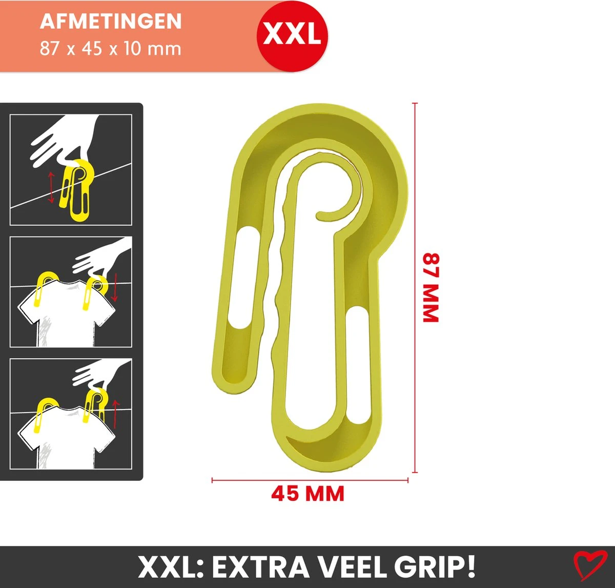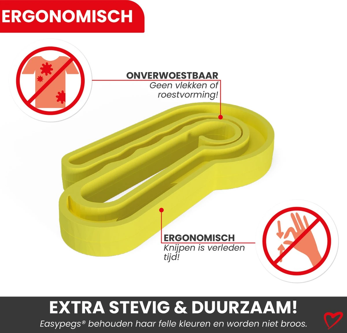 La compression est une chose du passé avec Easypegs. Grâce au mécanisme de serrage unique, ils tiennent confortablement dans la main et vous pouvez les glisser sans effort sur la corde à linge. Convient parfaitement aux personnes souffrant de rhumatismes ou d’autres troubles de la main. Avec Easypegs, vous ne souffrirez plus jamais d’empreintes ou de taches de rouille : ainsi votre linge propre reste vraiment propre ! Le plastique est résistant aux UV, donc la pince à linge conserve ses belles couleurs et ne devient pas cassante. Dimensions : 87 mm x 45 mm x 10 mm.