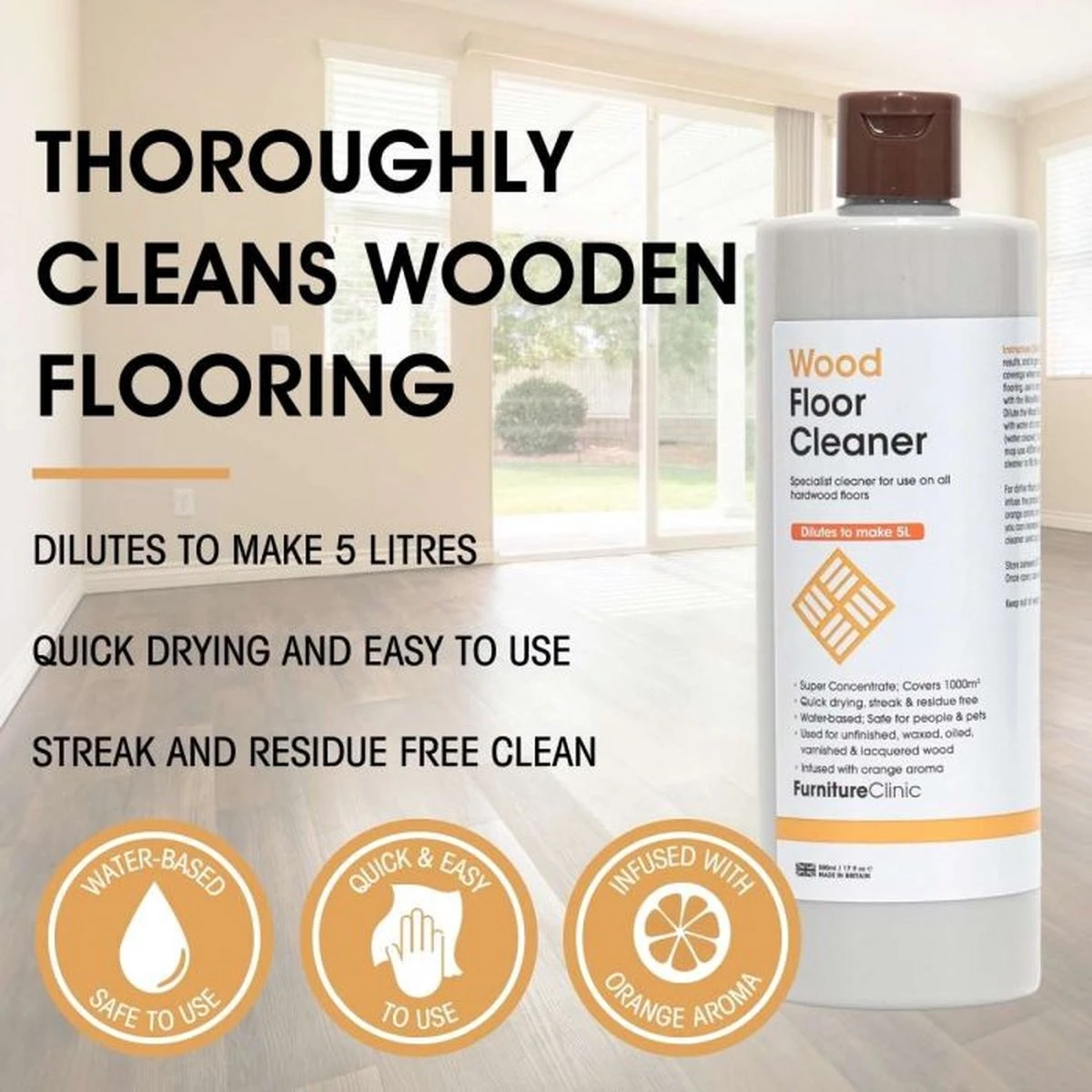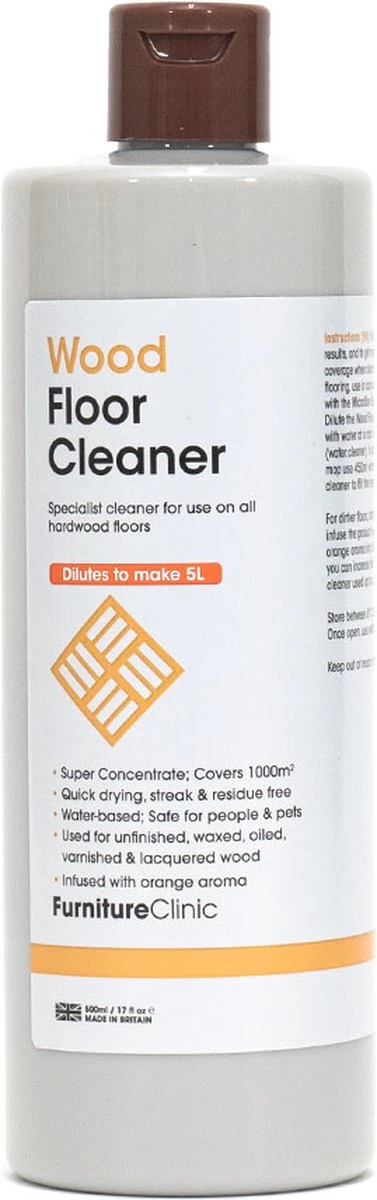 Notre Wood Floor Cleaner est un nettoyant super concentré pour tous les types de sols en bois. Si vous le diluez avec de l’eau, le flacon de 500 ml donne 5 litres de nettoyant pour parquet prêt à l’emploi qui nettoie facilement 1000 mètres carrés de sol ! La taille moyenne d’une pièce est de 16 mètres carrés, ce qui signifie que notre produit peut nettoyer une pièce de cette taille 61 fois !