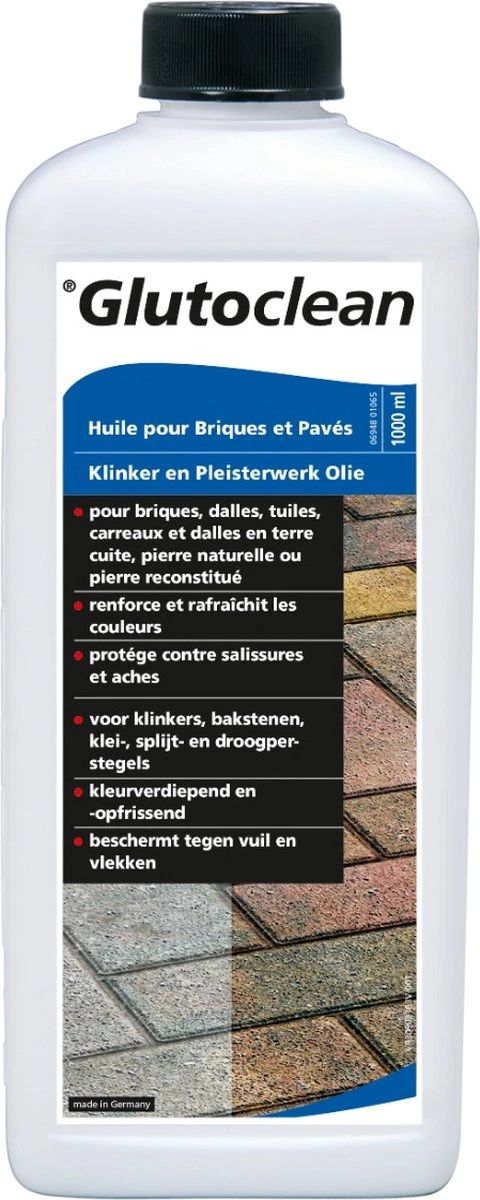 L’huile de clinker et de pavage Glutoclean restaure la couleur naturelle de tous les types de pavage et les protège contre la saleté et les taches. Convient à tous les types de pierres et de carreaux, pour une utilisation intérieure et extérieure.