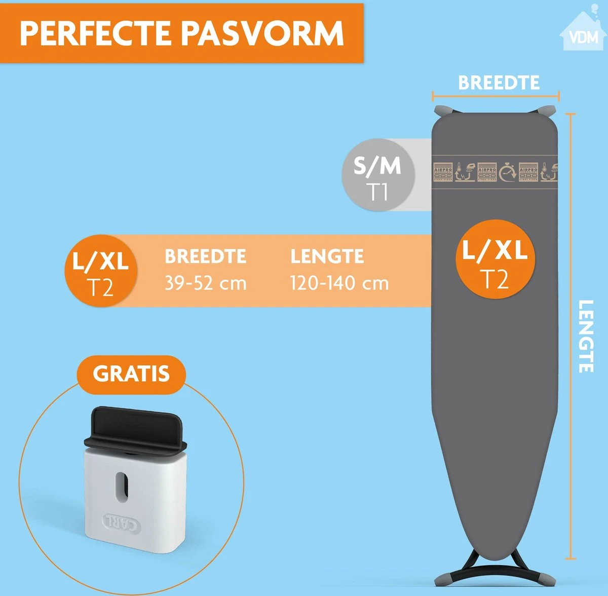 - L/XL Convient à alle merken de planches à repasser telles que Brabantia, Leifheit, Blokker et Vileda avec une largeur de 39-52 CM et une longueur de 120-140 CM