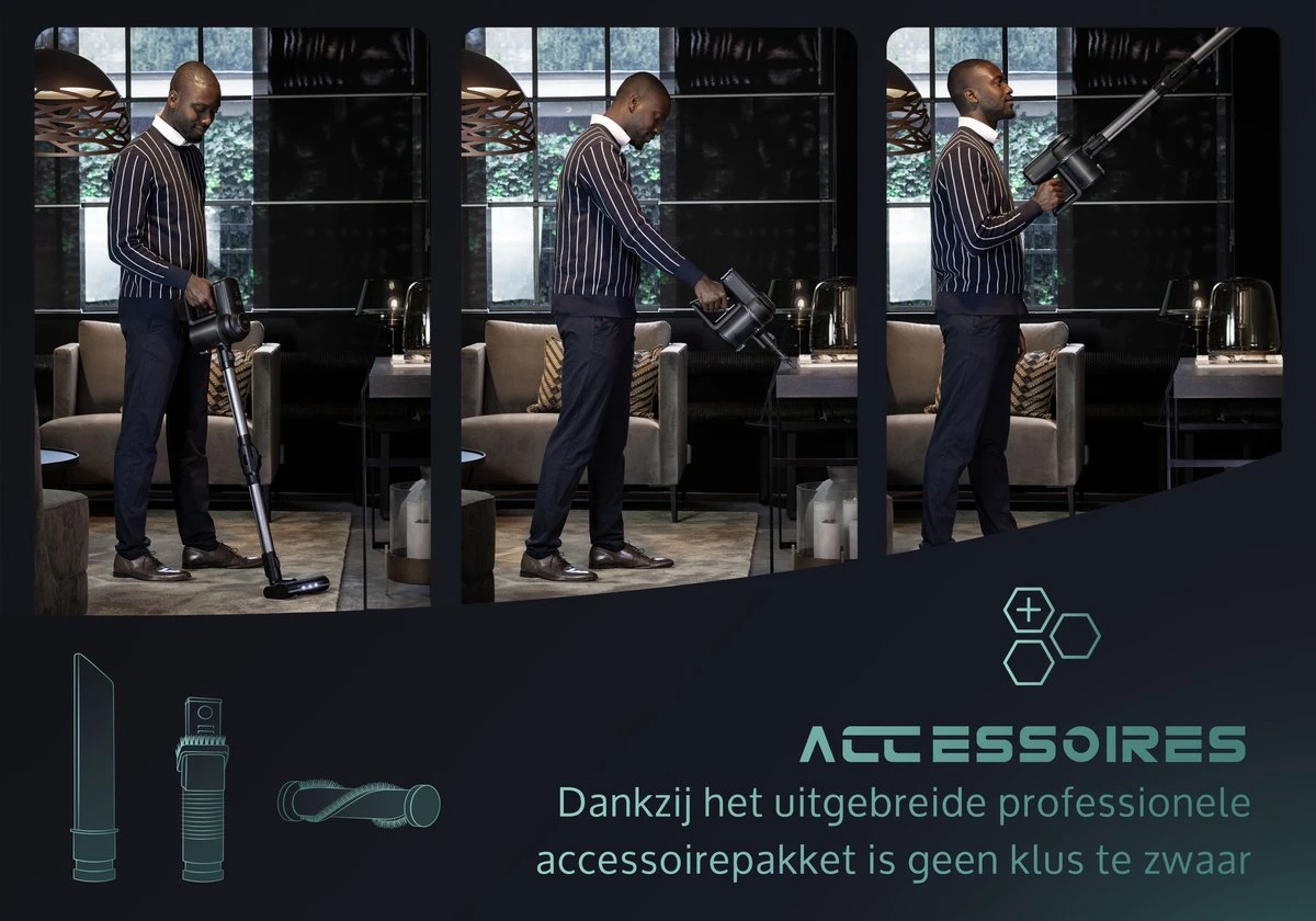 L’aspirateur-balai est également facile à utiliser pour d’autres travaux difficiles, simplement en changeant les accessoires. Cela vous permet également d’atteindre des endroits difficiles d’accès tels que des surfaces plus élevées.