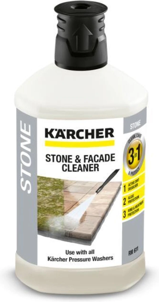 Nettoyant pour pierres et façades avec formule anti-corrosion. Cliquez simplement sur la bouteille de 1 litre et utilisez le nettoyeur haute pression