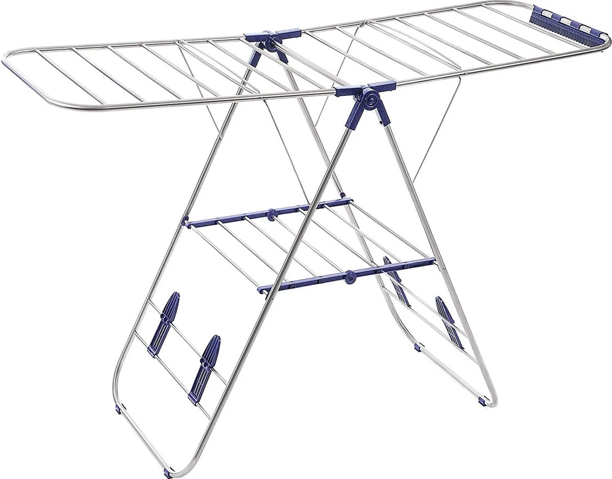 - Ailes réglables en hauteur (97-128 cm) – ajustez simplement les deux grandes ailes de séchage à la hauteur souhaitée et les pantalons, robes ou serviettes de bain peuvent être séchés sans toucher le sol ; idéal pour travailler debout, sans mal de dos