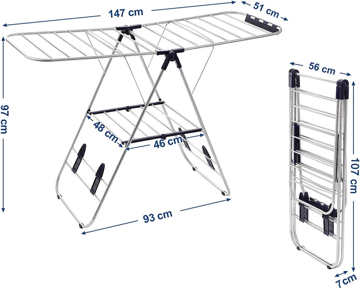 - Grande capacité : avec une taille entièrement dépliée de 147 x 128 x 56 cm (LxHxP), ce sèche-linge atteint une longueur de séchage de 16 m, optimale pour environ 2 charges de machine à laver ; Les vêtements, la literie ou les couettes peuvent être bien séchés sur les deux ailes de séchage ; max. La capacité de charge du séchoir est de 20 kg