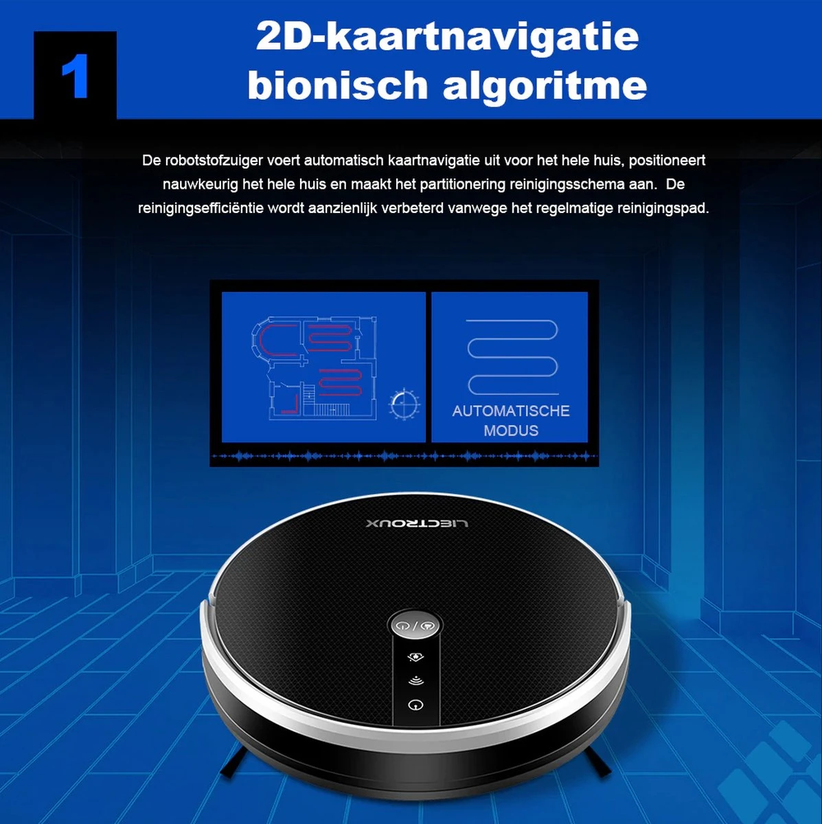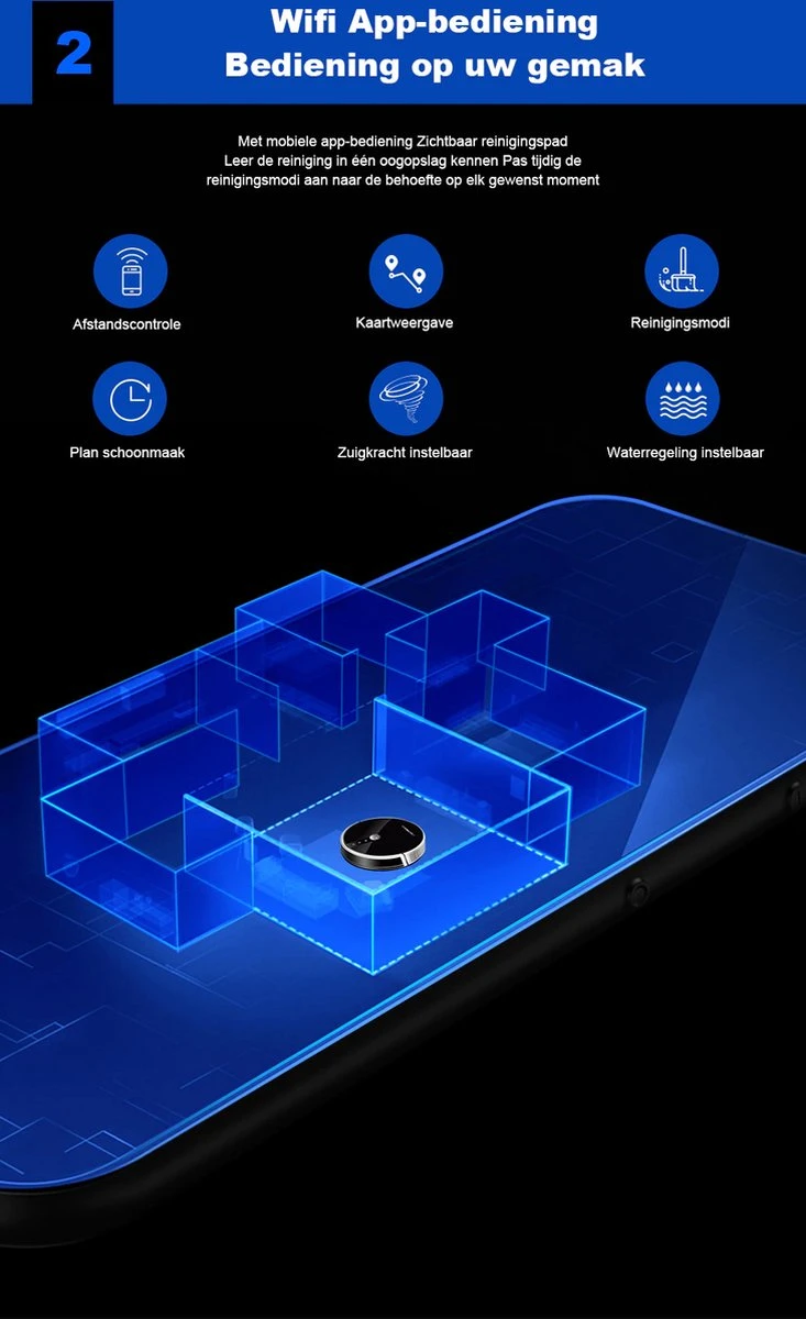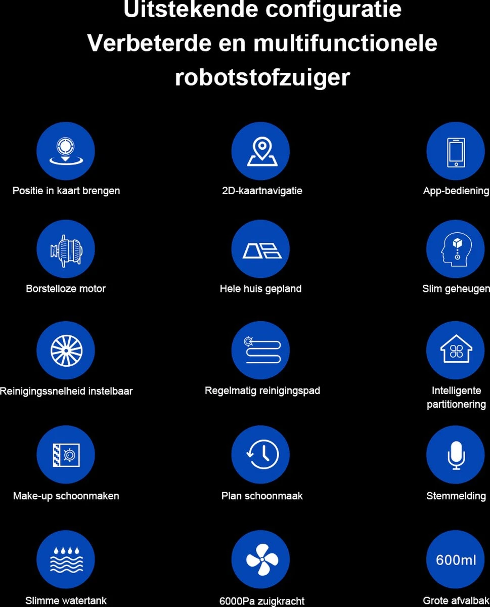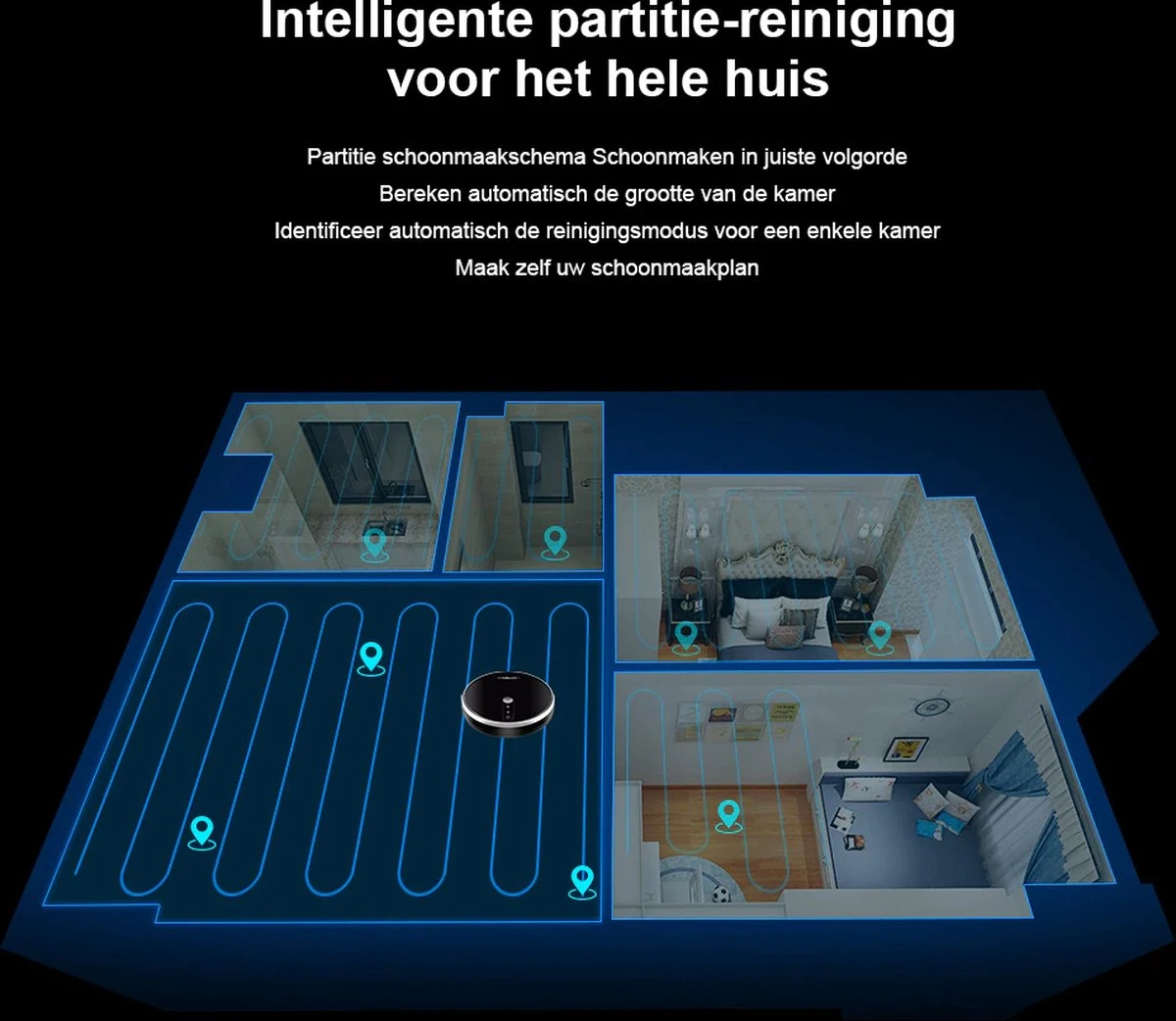 Le robot aspirateur et robot laveur électrique est l’un des plus performants de 2022 avec son caractère innovant. Grâce au radar laser intelligent Smart 360° avec technologie LDS et SLAM, ce robot nettoie très précisément. Via la carte que le robot crée en temps réel, des zones NO-GO peuvent être créées immédiatement dans l’application conviviale et le robot évitera parfaitement les objets. Grâce au système de triple filtre HEPA, ce robot est également idéal pour les personnes allergiques. La puissance d’aspiration élevée avec capteur de tapis et turbo boost, brosses doubles latérales et brosse centrale ne laisse aucune chance aux poils d’animaux. Avec une batterie lithium-ion super puissante de 2500 mAH, le nettoyage peut être effectué jusqu’à 1h30 à 2h00 et si cela ne suffit pas, le robot se recharge et continue là où il s’est arrêté.
