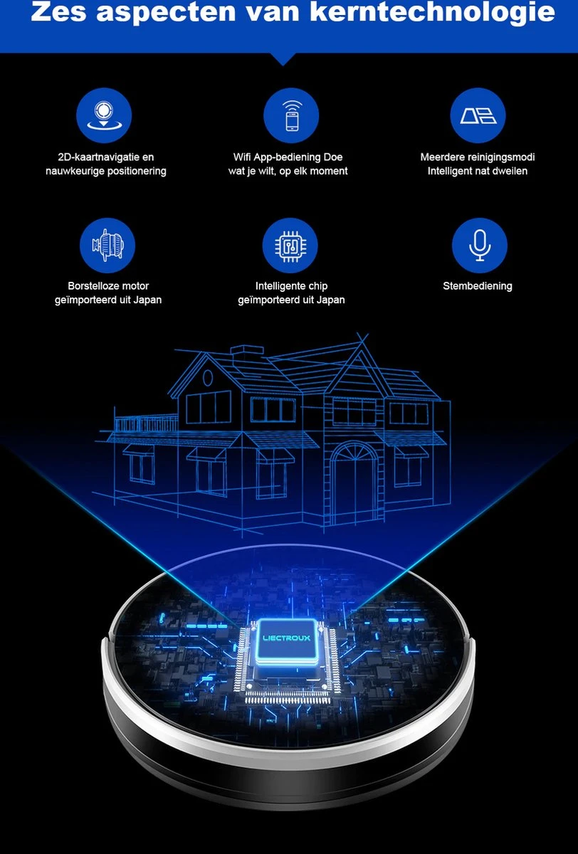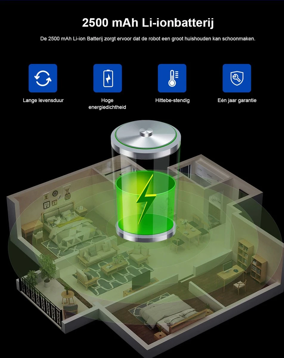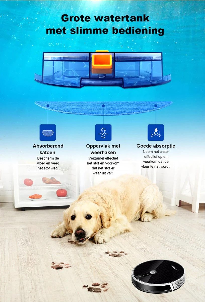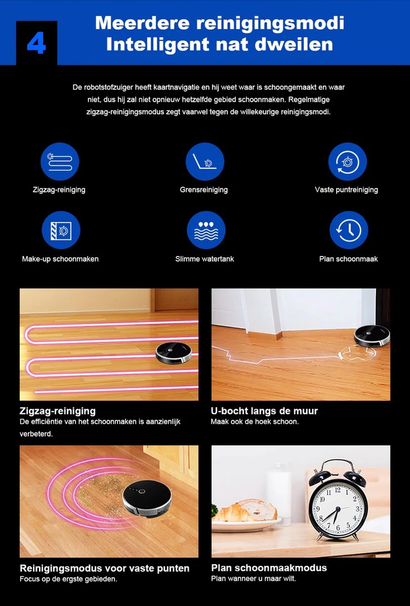 Le robot aspirateur et robot laveur électrique est l’un des plus performants de 2022 avec son caractère innovant. Grâce au radar laser intelligent Smart 360° avec technologie LDS et SLAM, ce robot nettoie très précisément. Via la carte que le robot crée en temps réel, des zones NO-GO peuvent être créées immédiatement dans l’application conviviale et le robot évitera parfaitement les objets. Grâce au système de triple filtre HEPA, ce robot est également idéal pour les personnes allergiques. La puissance d’aspiration élevée avec capteur de tapis et turbo boost, brosses doubles latérales et brosse centrale ne laisse aucune chance aux poils d’animaux. Avec une batterie lithium-ion super puissante de 2500 mAH, le nettoyage peut être effectué jusqu’à 1h30 à 2h00 et si cela ne suffit pas, le robot se recharge et continue là où il s’est arrêté.