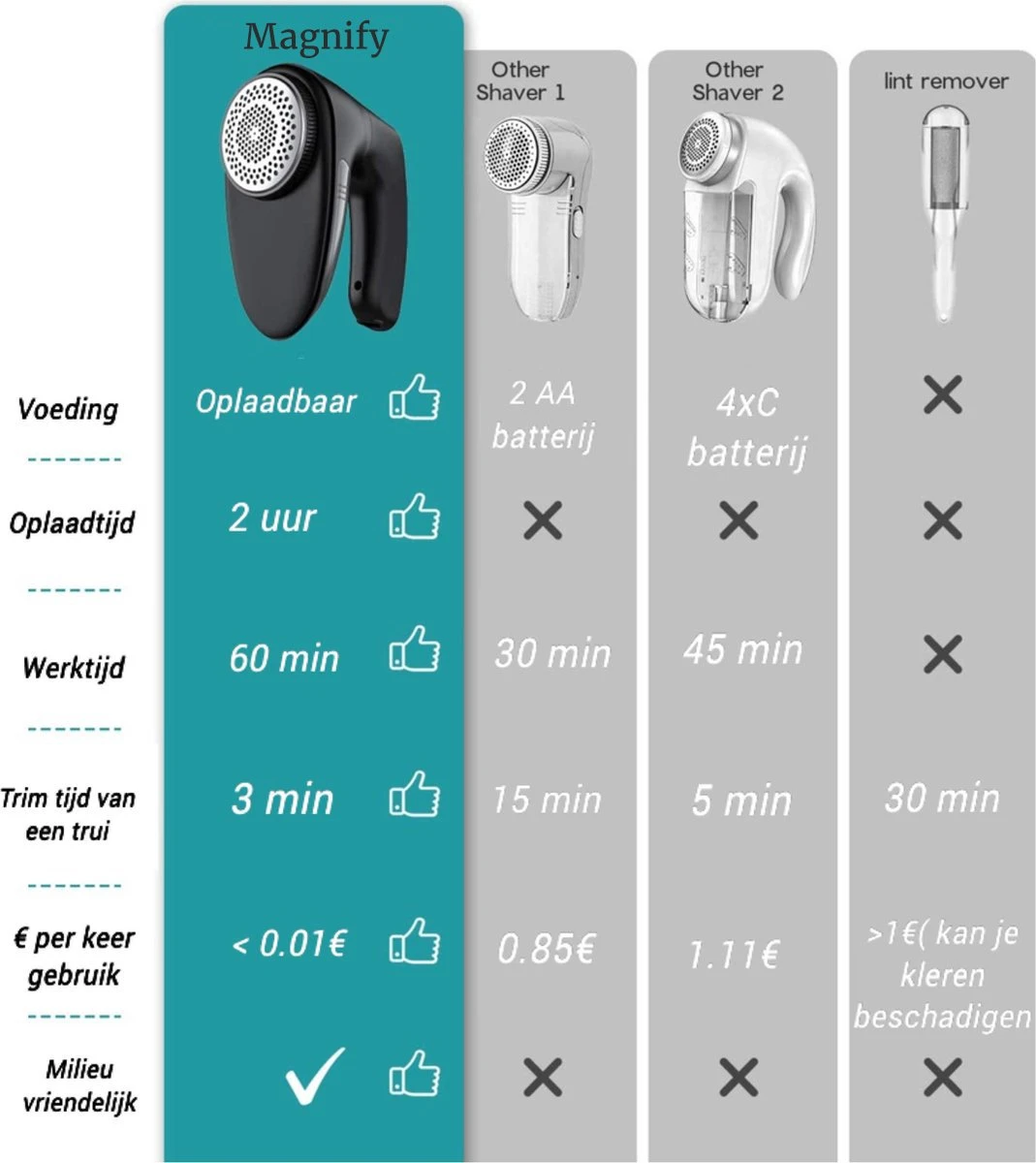 Vos vêtements ou vos meubles auraient-ils besoin d’un relooking ? Alors le coupe-peluches Magnify est l’outil parfait voor jou! Avec cette tondeuse à peluches, vous pouvez facilement et rapidement enlever les peluches et vos meubles ou vêtements seront comme nieuw. Sans fil et 60 minutes d’utilisation non-stop !