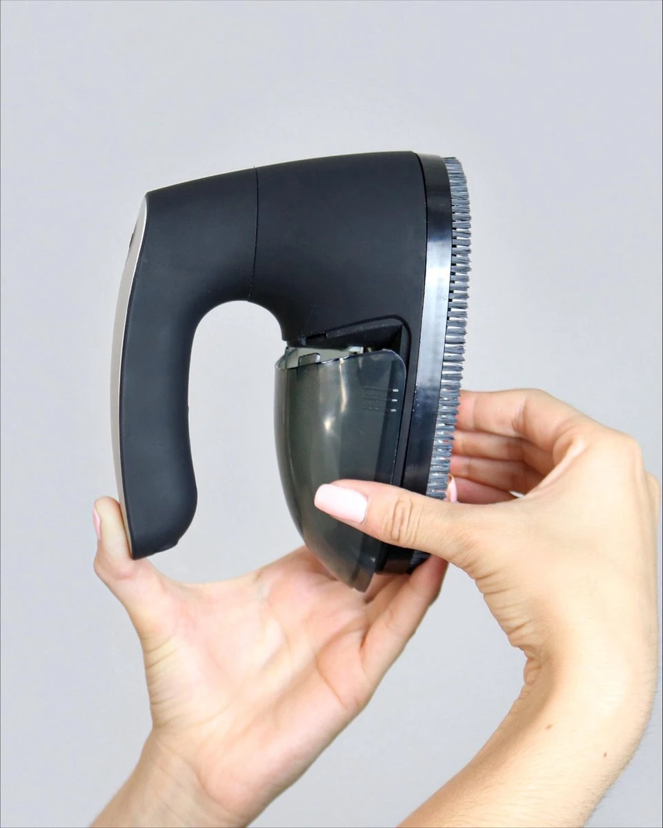 L’épilateur Magnify a un grand récipient de 160 ml. Poussez le levier vers le bas et le récipient se détache facilement. Lors de l’utilisation du rasoir anti-bouloche, les peluches détachées sont immédiatement aspirées, de sorte que les lames ne s’obstruent pas. Retirez le couvercle de la grille après utilisation et nettoyez rapidement et soigneusement les lames en acier inoxydable à l’aide de la brosse fournie. Rangez le rasoir dans le sac de rangement spécial et il pourra être réutilisé la fois suivante.