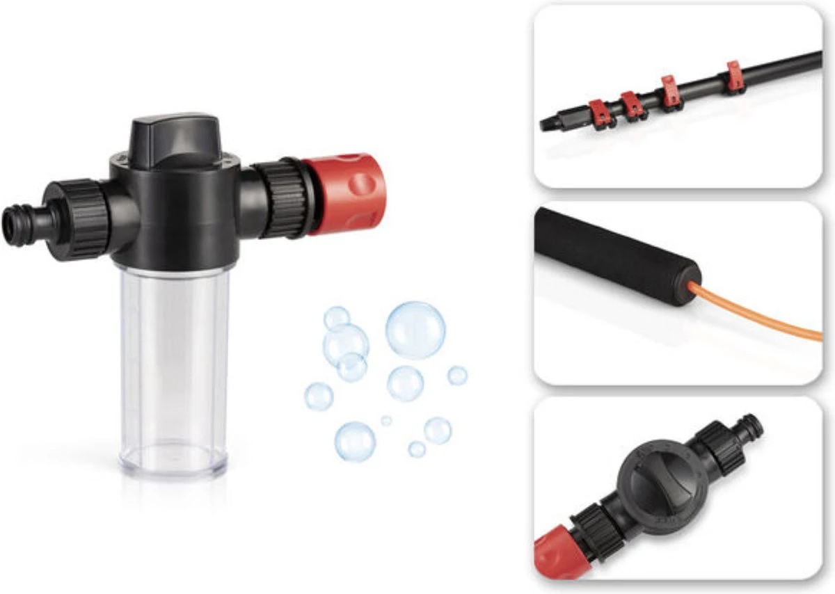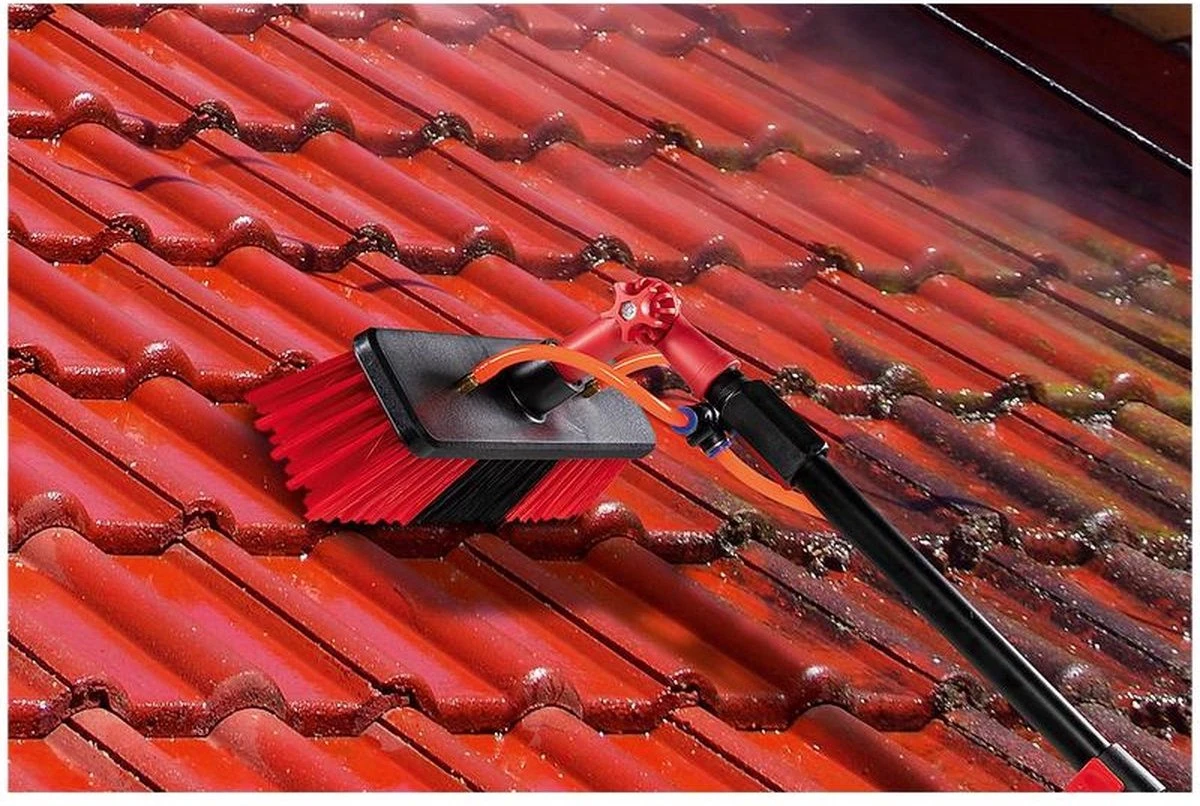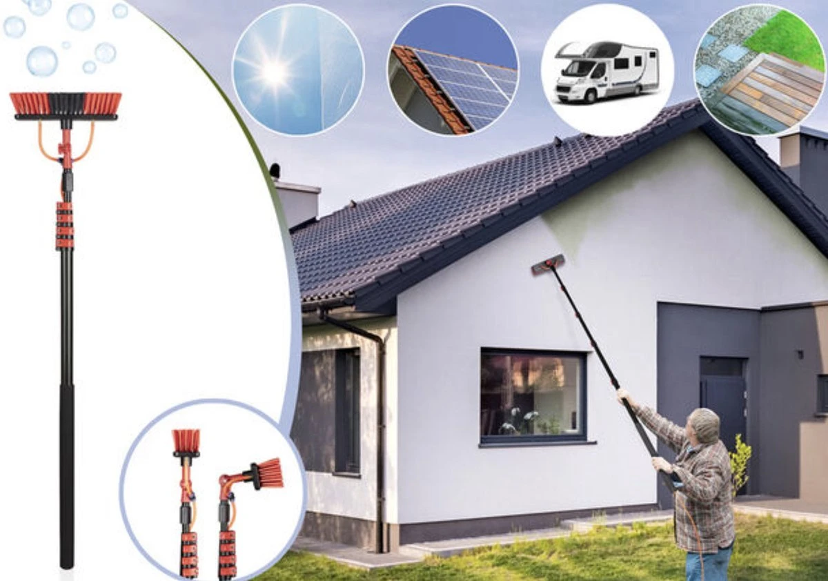 Le manche télescopique extensible avec brosse réglable est utile pour nettoyer vos panneaux solaires, le toit, la façade ou vos fenêtres, par exemple. Geen problème pour ce manche télescopique avec brosse. La longueur de 4,6 mètres et la brosse inclinable permettent d’atteindre facilement n’importe où. Connectez-le facilement à votre tuyau d’arrosage et nettoyez tous les endroits auparavant inaccessibles.