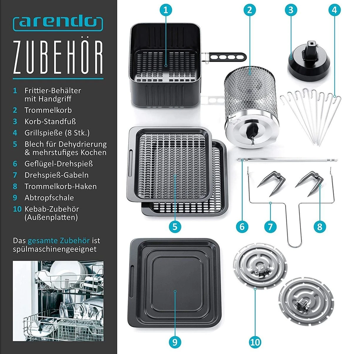 - Le bon équipement pour chaque application : vous recevez 8 brochettes, idéales pour le chachlik par exemple. Un poulet ou un döner peut être grillé sur un grand tournebroche rotatif. Vous pouvez remplir la chaise pivotante de pompons et le grand panier à friture est doté d’une poignée amovible pour un fonctionnement confortable. Les plaques coulissantes vous invitent à la cuisson des pizzas. Ou pour tremper les fruits. Tout ce que vous voulez.