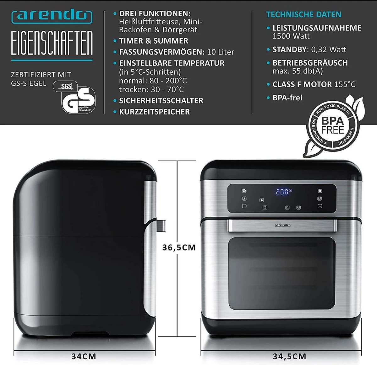 - Le four multifonction n’a pas besoin d’être préchauffé et, par rapport à un grand four, un volume nettement plus petit (10 litres) est chauffé. De cette façon, vous économisez de l’argent. Les températures réglables vont de 80 à 200 degrés ou 40 à 80 degrés pour le battage. La température souhaitée est atteinte particulièrement rapidement grâce à la fonction boost automatique. Le four de cuisson multifonctionnel est certifié GS.
