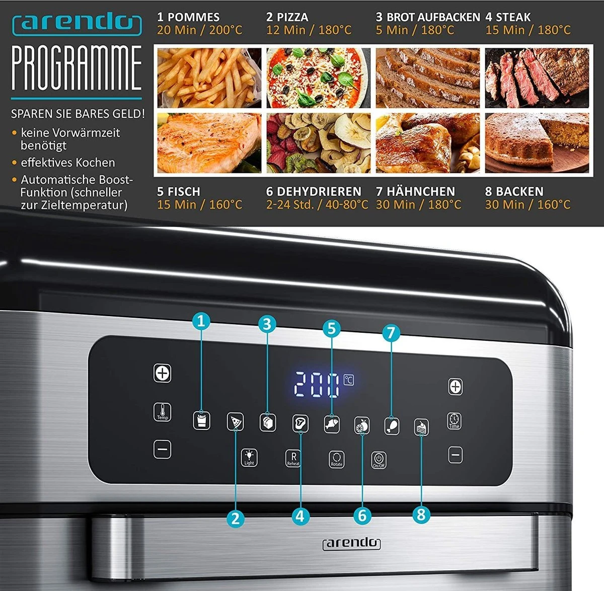 - Avec le four de cuisson multifonctionnel Forno obtenez trois appareils en un : friteuse à air, mini-four et déshydrateur. Vous pouvez frire, griller, rôtir, gratiner, griller, cuire et réchauffer. Le murmure des fruits est également possible. Essayez-le. Avec les 8 programmes (frites, poulet, viande, poisson, pizza, gâteau, pain, fonction séchage rapide), c’est facile de partir. Intéressant pour les petits ménages et comme deuxième appareil, par exemple pour cuire des petits pains. Intéressant aussi pour les campeurs. 303590
