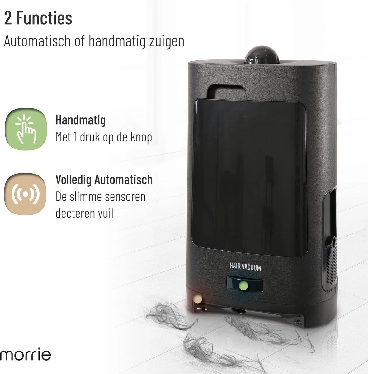 Pourquoi s’embêter quand cela peut se faire facilement? Les Cheveux, la poussière ou les miettes ont disparu en un seul passage. L’aspirateur à cheveux Morrie dans le coin de votre salon de coiffure, de votre cuisine ou de votre salle de bain aspire tous les déchets du sol en un rien de temps. Tout ce que vous avez à faire est de le balayer jusqu’à la «bouche» de la poubelle automatique à aspiration automatique de Morrie. Geen de tracas avec une pelle à poussière et une pelle à poussière et plus de saleté à côté de la poubelle. L’assistant parfait pour un usage professionnel et domestique!
