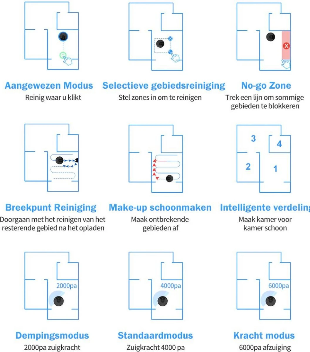 Le robot dispose d’un total de quinze fonctions pour n’en citer que quatre : La première est le mode automatique, si vous l’allumez, le robot se déplacera et nettoiera tout. Frappe-t-il un mur, le robot voit-il un bord ou atterrit-il sur l’une de vos bandes qui fonctionnent comme des murs imaginaires ? Ensuite, il se retourne automatiquement pour que le robot ne tombe pas. Le deuxième mode est le mode spot, qui est spécialement conçu pour nettoyer très bien les petites taches sales. Ensuite, nous avons le mode bord, avec ce mode, le robot recherche tous les bords et les nettoie bien. Le quatrième mode est le contrôle manuel, avec lequel vous pouvez même contrôler le robot où vous voulez via l’application ou la télécommande !
