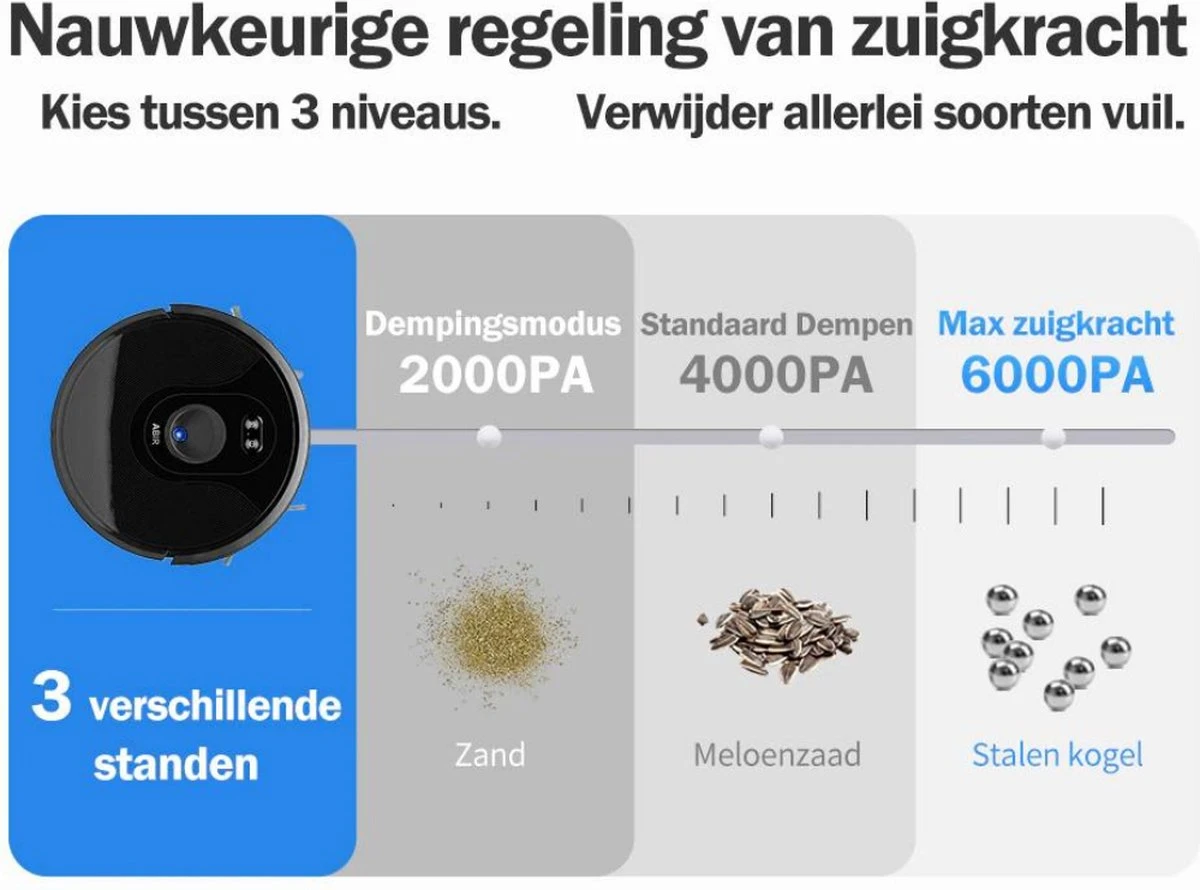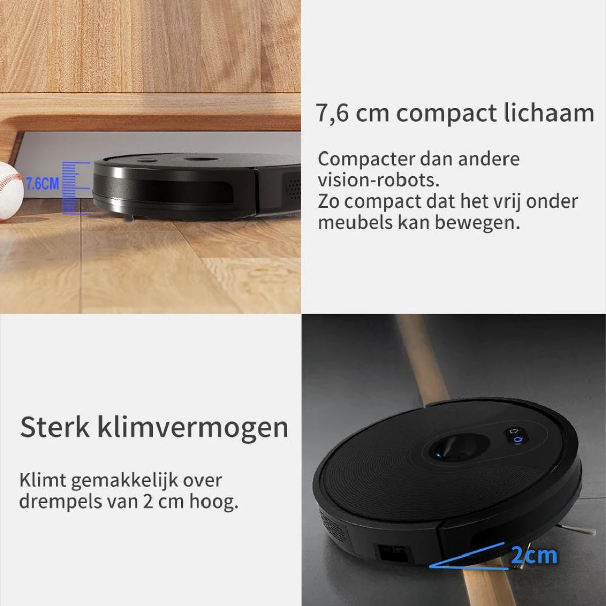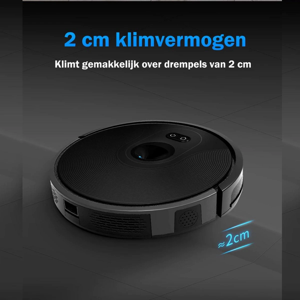 L’aspirateur robot a une puissance d’aspiration élevée, ce qui signifie que chaque saleté est emportée par la machine. Dès que la machine rencontre un tapis, elle augmente automatiquement sa puissance d’aspiration au maximum afin que le tapis soit également impeccable. Les brosses qui balayent normalement le sol sont alors relevées pour ne pas l’abîmer. Le robot a une bonne batterie qui dure jusqu’à 2 heures d’aspiration.